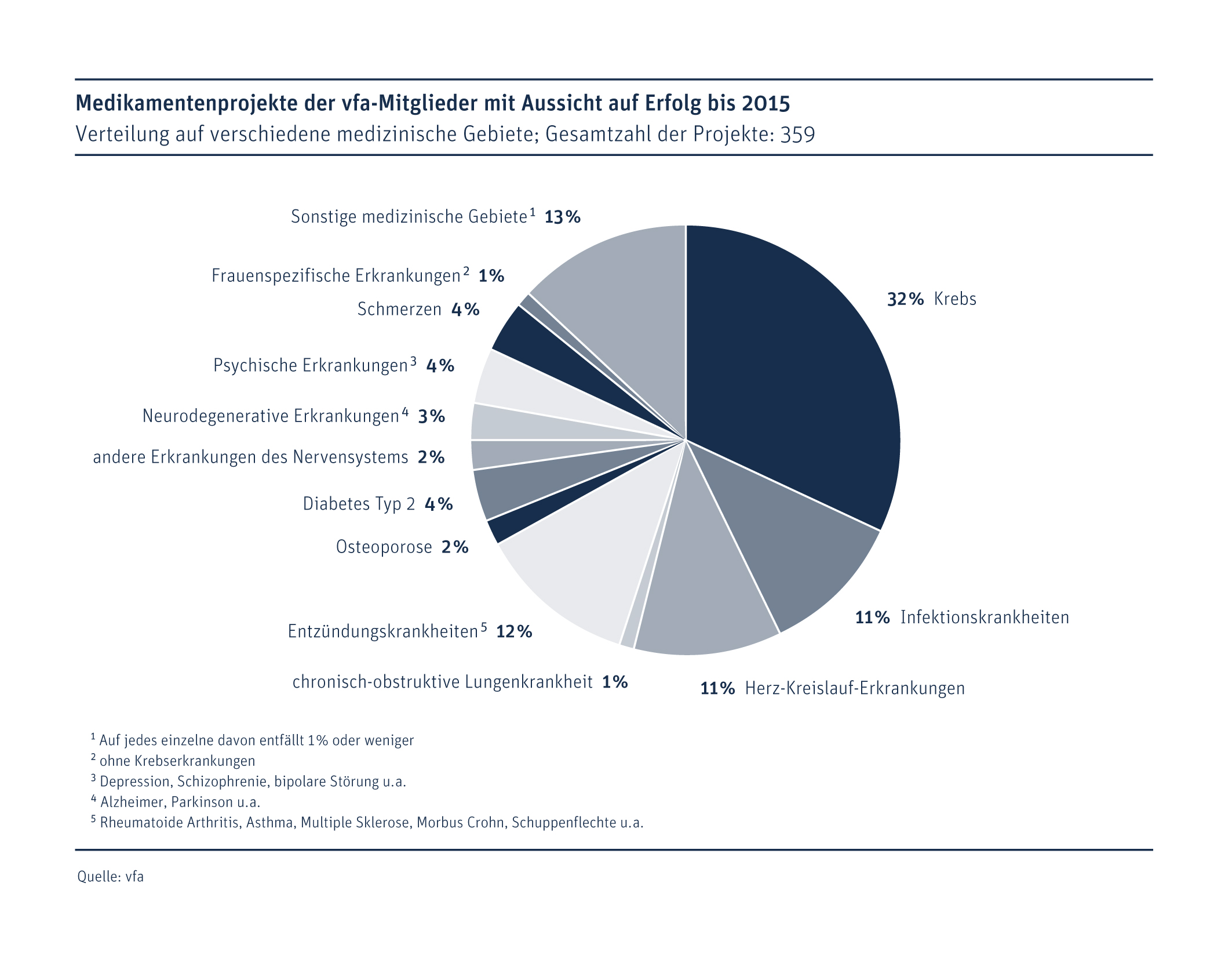Laut Erhebung konzentrieren sich die forschenden Pharma-Unternehmen bei ihren Medikamenten-Projekten zu wesentlichen Teilen auf Krebs (32 % der Projekte), Entzündungskrankheiten wie Rheuma (12%), Infektions- (11 %) und Herz-Kreislauf-Erkrankungen (11 %).