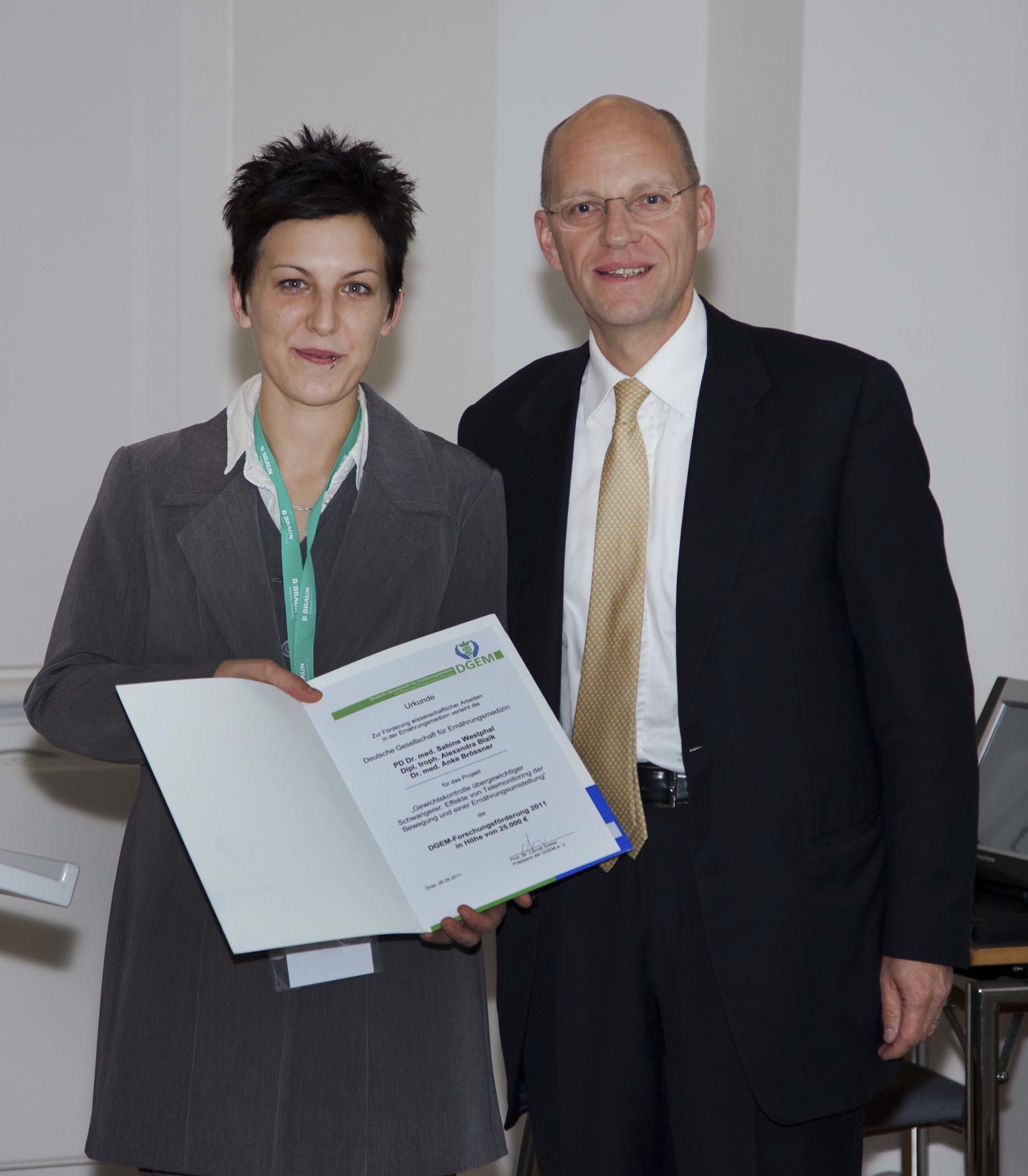 Übergewichtige Schwangere entwickeln auch akute und chronische Komplikationen, dazu gehört unter anderem auch ein schwangerschaftsassoziierter Hypertonus (Bluthochdruck) oder Präeklampsie/Eklampsie (Krampfanfälle). Übergewicht und übermäßige Gewichtszunahme in der Schwangerschaft sind daher im Interesse der Gesundheit von Mutter und Kind zu vermeiden. Die Deutsche Gesellschaft für Ernährungsmedizin (DGEM) hat deshalb ihre Forschungsförderung 2011 an das Projekt „Gewichtskontrolle übergewichtiger Schwangerer: Effekte von Telemonitoring der Bewegung und einer Ernährungsumstellung" vergeben, das von Prof. Dr. Sabine Westphal, Dr. troph. Alexandra Blaik, Institut für Klinische Chemie und Pathobiochemie der Otto-von-Guericke-Universität und Dr. Anke Brössner, Klinik für Reproduktionsmedizin und Gynäkologische Endokrinologie der Otto-von-Guericke-Universität Magdeburg eingereicht worden war. Auf der DGEM Fortbildungstagung im schwäbischen Irsee wurde die mit 25.000 Euro dotierte Forschungsförderung verliehen. Für den Pilotversuch werden noch Teilnehmerinnen aus der Region Magdeburg gesucht.