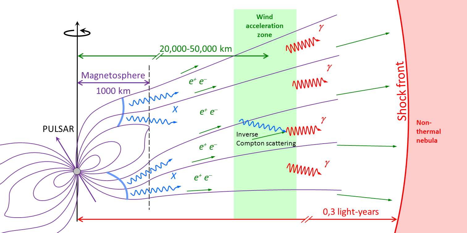 The generally accepted paradigm postulates the existence of a relativistic wind of electrons and their antiparticles, positrons, which originates in the pulsar’s magnetosphere and terminates in the interstellar medium. The evolution of the wind is characterized by three consecutive processes (Fig. 2): At a distance of about 1000 km from the pulsar, the pulsar’s rotational energy is transformed into electromagnetic energy, which in turn is converted to kinetic energy of bulk motion, i.e. acceleration of the wind. Finally, the wind terminates by collision with matter in a standing reverse shock about 0.3 light years away. Thereby, the electrons and positrons are accelerated up to extremely high energies, resulting in an extended non-thermal source: the Crab nebula. All three processes need to proceed with incredibly high (close to 100 %) efficiency in order to explain the observational data.