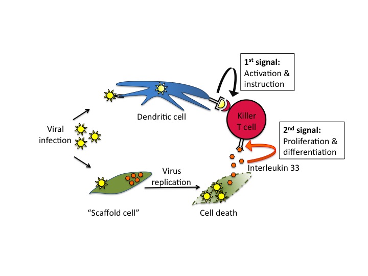 Wie die Forschergruppen von Prof. Löhning (Charité Universitätsmedizin & DRFZ Berlin) und Prof. Pinschewer (Universität Genf) aktuell im weltweit renommierten Wissenschaftsjournal SCIENCE berichten, gibt es einen zweiten grundlegenden Mechanismus, wie Virusinfektionen die bekannten Höchstleistungen von Killer T-Zellen auslösen: „Die sterbenden mit Viren infizierten Körperzellen selbst läuten bei den Killer T-Zellen die Alarmglocken.“, erklärt Prof. Löhning. Viren führen zum Tod von infizierten Zellen, und damit zur Freisetzung von Zellbestandteilen, welche normalerweise für Killer T-Zellen unsichtbar sind – vergleichbar austretendem Blut bei einer Verletzung. Solche Zellbestandteile bedeuten Zellschaden und werden daher als „Alarmine“ bezeichnet. Die genannten Wissenschafter haben nun herausgefunden, dass Killer T-Zellen das Alarmin „Interleukin 33“ (IL-33) erkennen können. IL-33 ist in Zellen enthalten, welche das Gerüst von Milz und Lymphknoten bilden, also sozusagen das Heim von Killer T-Zellen, und es wird beim Zerstören dieser Gerüst-Zellen freigesetzt.