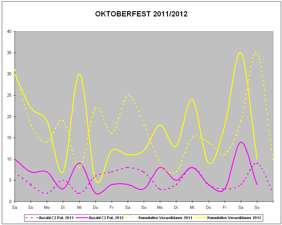 Die Verteilung dieser Patienten mit Alkoholintoxikation auf die einzelnen Tage der Wiesn im Vergleich von 2011 und 2012 ist in der nachfolgenden Abbildung dargestellt. Dabei zeigt sich, dass ein erhöhtes Patientenaufkommen am ersten Wochenende, am ersten Mittwoch sowie am Anfang und in der Mitte der zweiten Wiesnwoche festzustellen ist. Der Höhepunkt lag beim letzten Oktoberfest-Samstag.