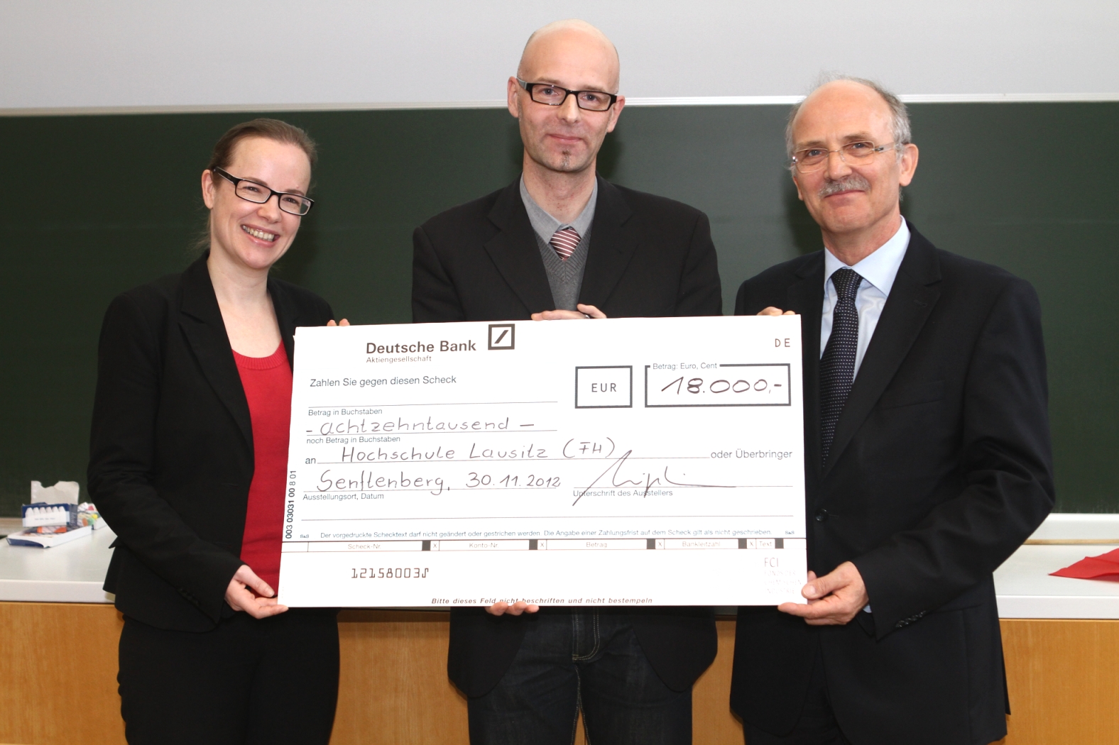 „Bildung ist der Rohstoff für eine erfolgreiche Zukunft“, sagt Dr. Jana Scheunemann, Referentin für Bildungspolitik beim Landesverband Nordost des Verbandes der Chemischen Industrie e.V. (VCI). Sie überreichte den symbolischen Scheck im Rahmen des Wissenschaftsstages Chemie an der Hochschule Lausitz (FH). Dabei stellte sie fest: „Wir sind als chemische Industrie auf gut ausgebildeten Nachwuchs angewiesen. Nur mit sehr gut ausgebildeten Wissenschaftlern, Ingenieuren und Technikern kann das Industrieland Deutschland erfolgreich und international wettbewerbsfähig sein.“