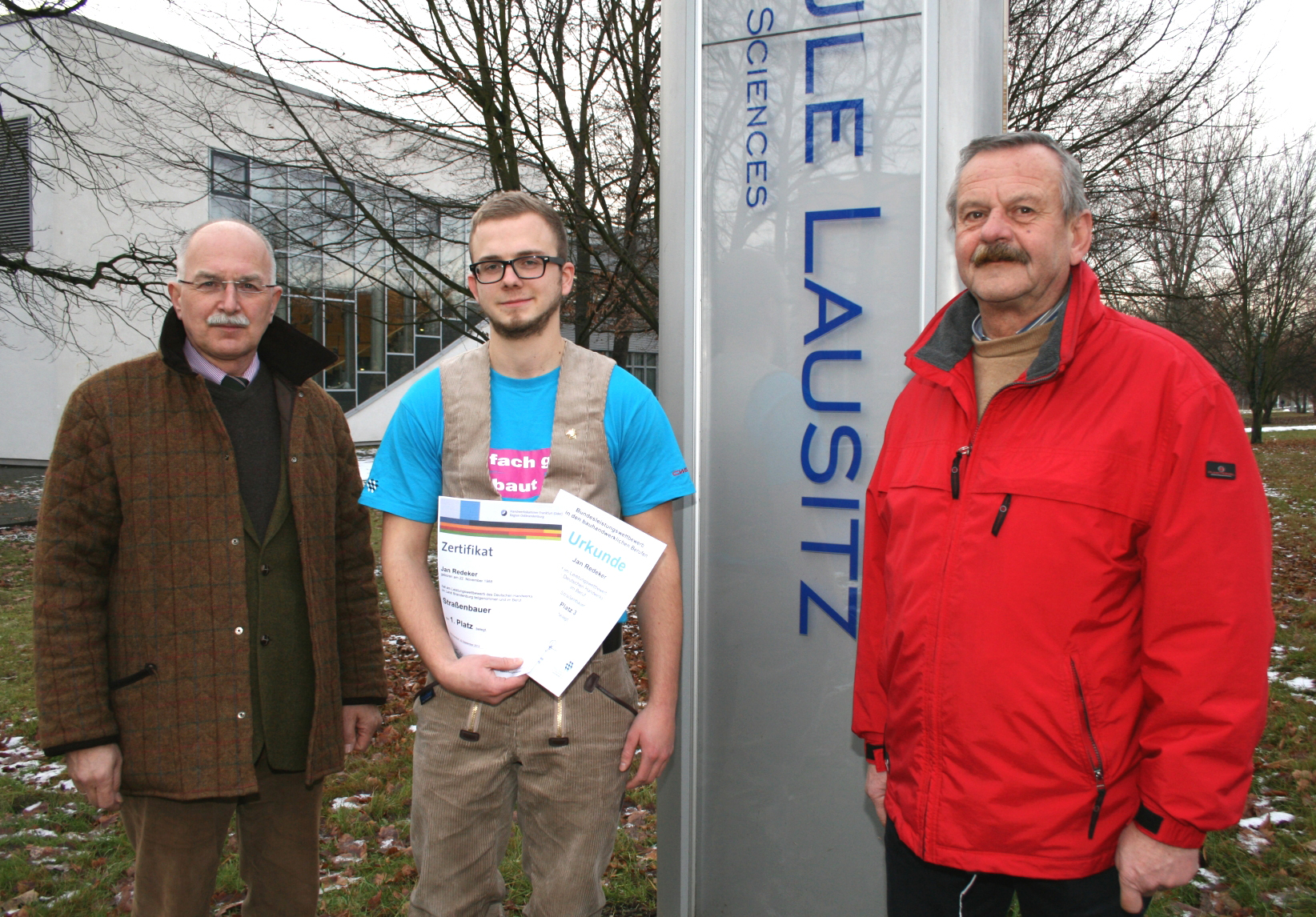 Jetzt wurde ihm im Rahmen der Bestenfeier der Handwerkskammer in Frankfurt (Oder) eine Ehrenurkunde für seine hervorragenden Leistungen überreicht. Zuvor hatte er im September 2012 bei dem im Lehrbauhof Großräschen ausgetragenen Leistungswettbewerb des Deutschen Handwerks im Land Brandenburg den ersten Platz im Beruf Straßenbauer belegt. Bei den deutschen Meisterschafen der Straßenbauer errang er im November in Kenn bei Trier in einem Feld von elf Teilnehmern aus der gleichen Anzahl von Bundesländern für Brandenburg einen hervorragenden dritten Platz. Jan Redeker ist der erste Student eines dualen Studiengangs, der je an einem derartigen bundesweiten Vergleich teilgenommen hat.