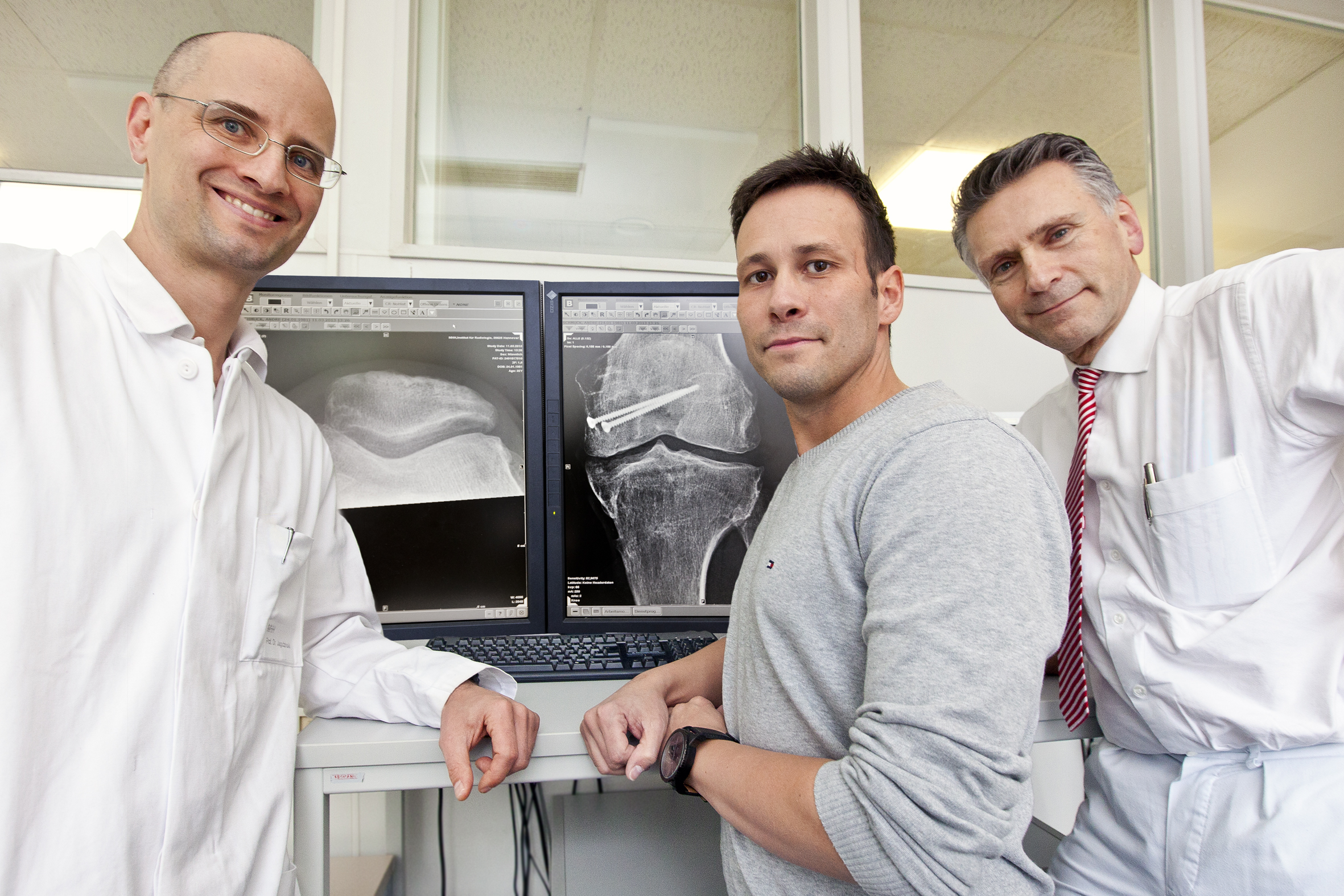 „Die MHH ist die einzige Klinik in Deutschland, die in der Lage ist, ganze Gelenkflächen aus körpereigenem Material zu ersetzen, in Kombination mit dem Ersatz von Gelenkknorpel und Bändern“, sagt Professor Jagodzinski. Einer der Patienten mit einem Gelenk dieser Art ist André S. Bei einem Autounfall 2006 wurde sein halbes linkes Knie zerstört. In einer Klinik in Thüringen wurde seine Wunde damals versorgt, mit der Aussicht auf ein künstliches Kniegelenk wurde er entlassen. Als er eineinhalb Jahre später in die MHH kam, hatte er immer noch starke Schmerzen und konnte nicht richtig laufen. „Sowohl im oberen als auch im unteren Teil des Kniegelenks waren Knochen und Knorpel geschädigt“, erinnert sich Professor Jagodzinski. Der Gelenkchirurg setzte André S. im März 2008 neue Knorpel, Sehnen und Gelenkflächen ein. Für die Knorpel wurden dem Patienten sechs Wochen vor der OP körpereigene Knorpelzellen entnommen und im Labor gezüchtet. Die Sehnen stammten vom Oberschenkelstreckmuskel des jungen Mannes. „Um die Knochenstücke nachzubilden, haben wir einen Knochenblock aus dem Beckenkamm herausgenommen und während der Operation mit einer speziell dafür angefertigten Kopierfräse die benötigten Teile angefertigt“, erklärt Professor Jagodzinski. Als Vorlage für die Rekonstruktion dienten Vergleichsbilder vom gesunden Knie. Etwa ein Jahr lang hatte das Team um Professor Jagodzinski diesen Eingriff vorbereitet. Inzwischen sind fünf Jahre vergangen und glücklicherweise hat es bisher keine Komplikationen gegeben. „Es gab keinen Infekt, die Implantate sitzen immer noch sehr gut und die Arthrose des Patienten ist kaum fortgeschritten“, resumiert der Gelenkchirurg. Auch André S. ist mit dem Ergebnis zufrieden. Er ist froh, dass er vorerst um ein künstliches Kniegelenk, das etwa 15 Jahre hält, herumgekommen ist. „Ich komme im Alltag gut zurecht“, sagt der heute 32-Jährige, der gerade seine Diplom-Arbeit in Elektrotechnik schreibt. Damit sein Zustand weiterhin so gut bleibt, hält er sich körperlich fit. „Ich versuche, mein Körpergewicht zu halten, gehe ins Fitness-Studio und fahre Rad.“ Einmal pro Jahr kommt er zum Check in die MHH.