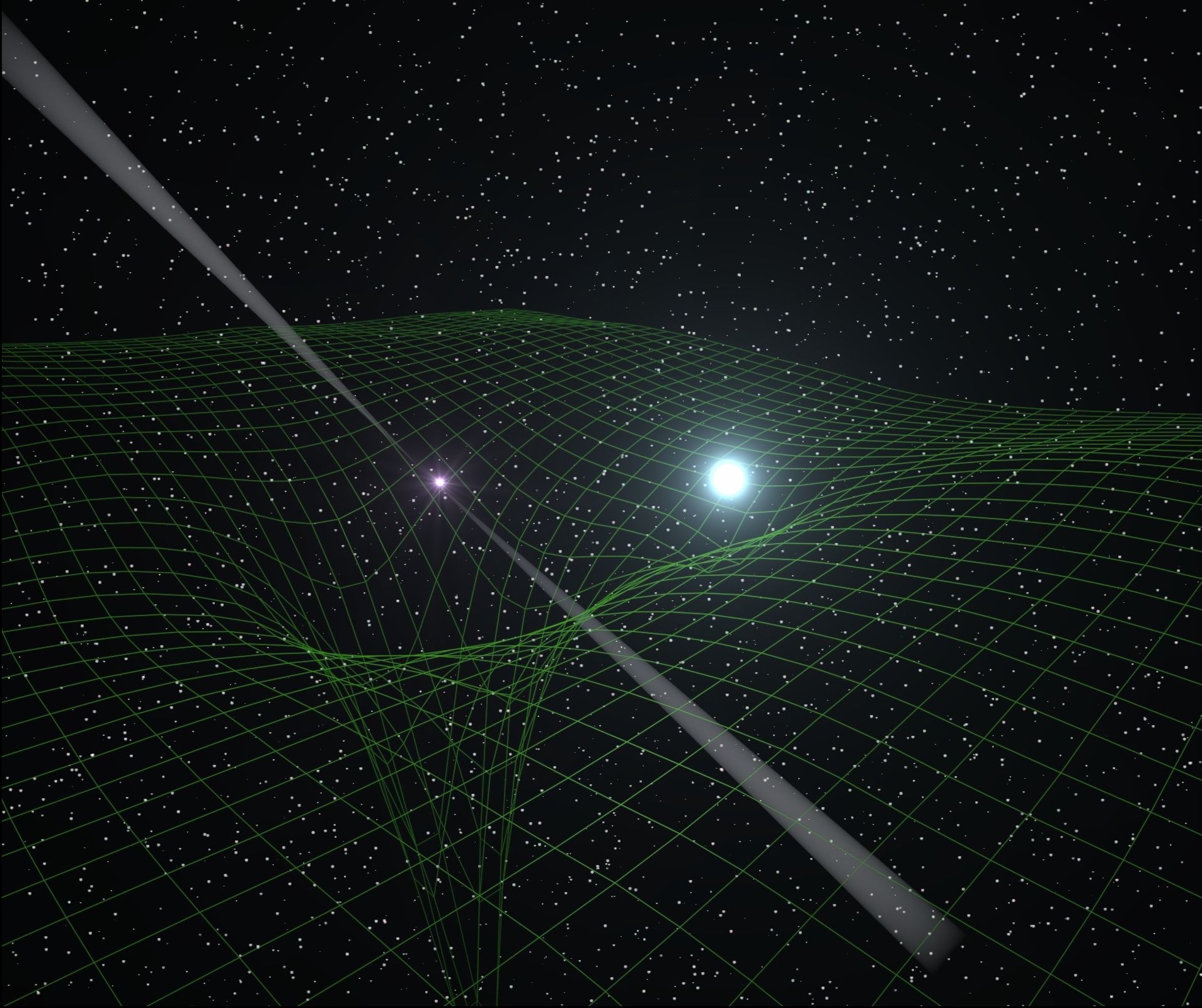 In terms of gravity, PSR J0348+0432 is a truly extreme object, even compared to other pulsars which have been used in high precision tests of Einstein’s general relativity. At its surface, for example, it has a gravitational strength that is more than 300 billion times stronger than that on Earth. In the center of that pulsar, more than one billion tons of matter is squeezed into a volume of a sugar cube. These numbers nearly double the ones found in other ‘pulsar gravity labs’. In the language of general relativity, astronomers were able for the first time to precisely investigate the motion of an object with such a strong space-time curvature (see Fig. 1). “The most exciting result for us was, that general relativity still holds true for such an extreme object”, says Norbert Wex, a theoretical astrophysicist in MPIfR’s fundamental physics research group. In fact, there are alternative theories that make different predictions, and therefore are now ruled out. In this sense, PSR J0348+0432 is taking our understanding of gravity even beyond the famous ‘Double Pulsar’, J0737-3039A/B, which was voted as one of the top ten scientific breakthroughs of 2004 by the ‘Science’ journal.