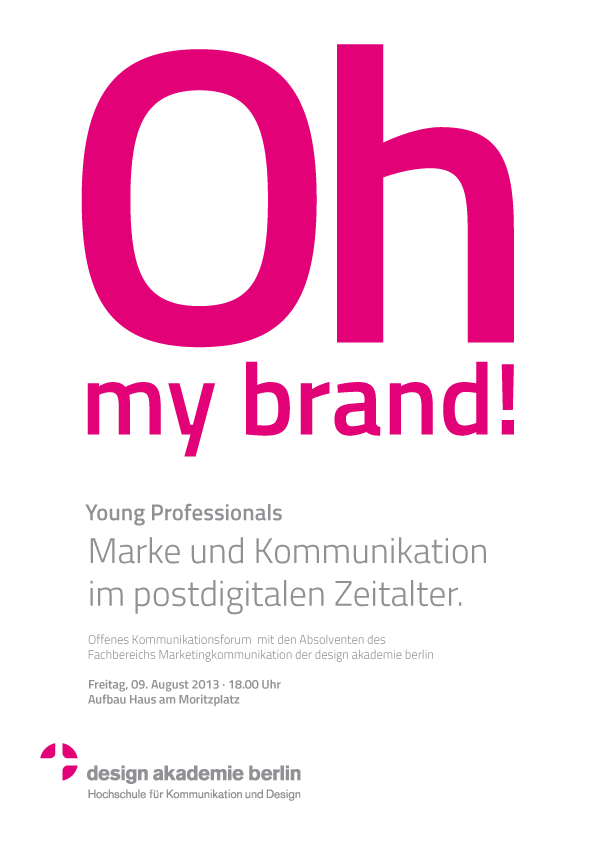 Das Digitale wird nur noch durch seine Abwesenheit wahrgenommen, nicht mehr durch seine Gegenwart. Im offenen Kommunikationsforum „Oh my brand!“ diskutieren Absolventen des Fachbereiches Marketingkommunikation der design akademie berlin, Hochschule für Kommunikation und Design am 9. August 2013 ihre Thesen und Perspektiven zur Differenz von analogen und digitalen Medien und veränderten Blickwinkeln im Post-Digitalismus mit Branchengast Klaus Schwab (Strategieberater). Moderiert wird das Kommunikationsforum von Gerd Brendel, Deutschlandradio Kultur.