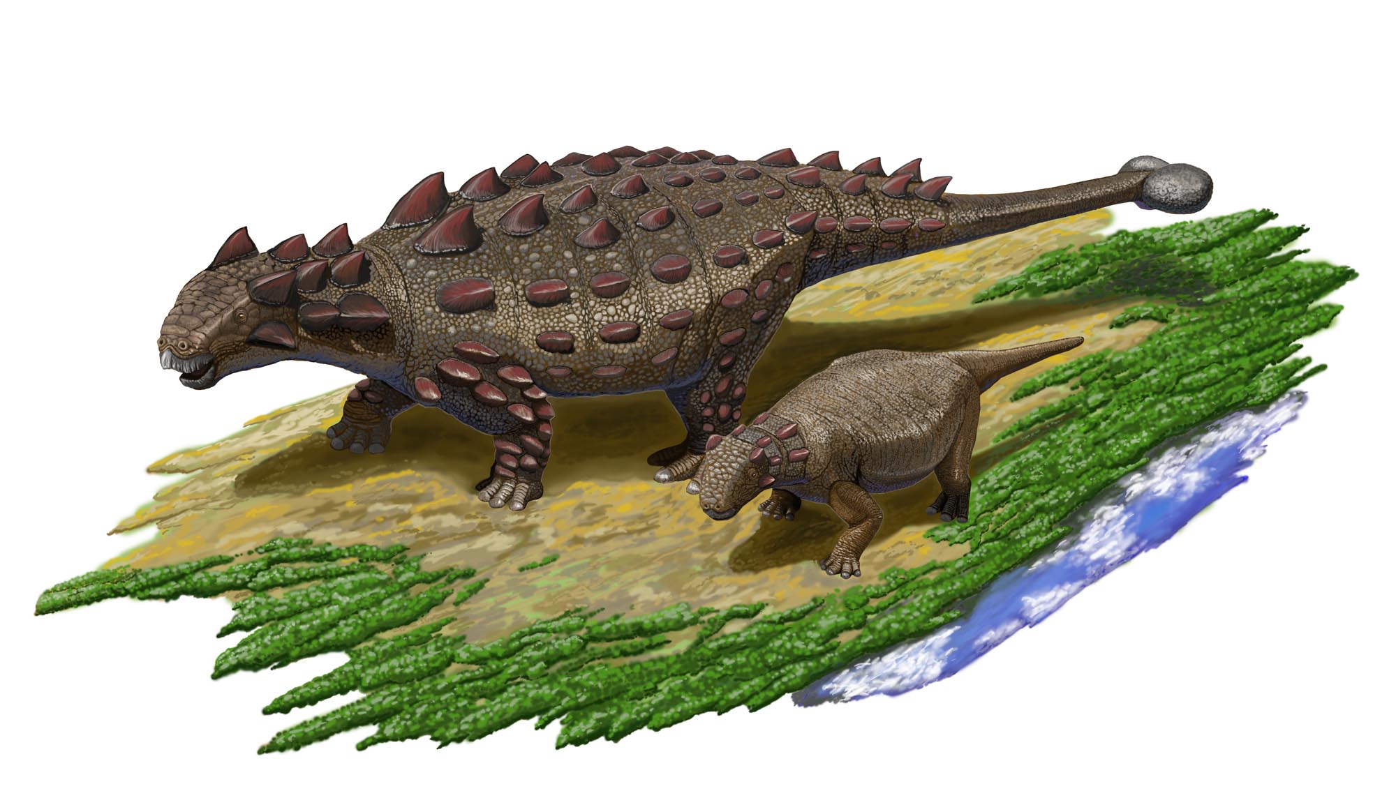 Erwachsene Ankylosaurier glichen einer uneinnehmbaren Festung: Dicke Knochenplatten in ihrer Haut schützten Kopf, Nacken, Rücken und Schwanz. Bei manchen Arten waren sogar die Augenlider verknöchert. Selbst große Fleischfresser wie der Tyrannosaurus dürften es schwer gehabt haben, diese Rüstung zu knacken. Doch die bisssichere Weste entwickelte sich erst in den ersten Lebensjahren. Bei Jungtieren fehlte sie weitgehend, wie Fossilfunde dokumentieren. Irgendwann in der frühen Wachstumsphase bildeten sich dann die teils flachen, teils dornenförmigen Hautauflagerungen. Dazu benötigten die Tiere jede Menge Kalzium und Phosphor – immerhin konnten die Verknöcherungen das Volumen eines kleinen Schuhkartons erreichen. Doch woher nehmen?