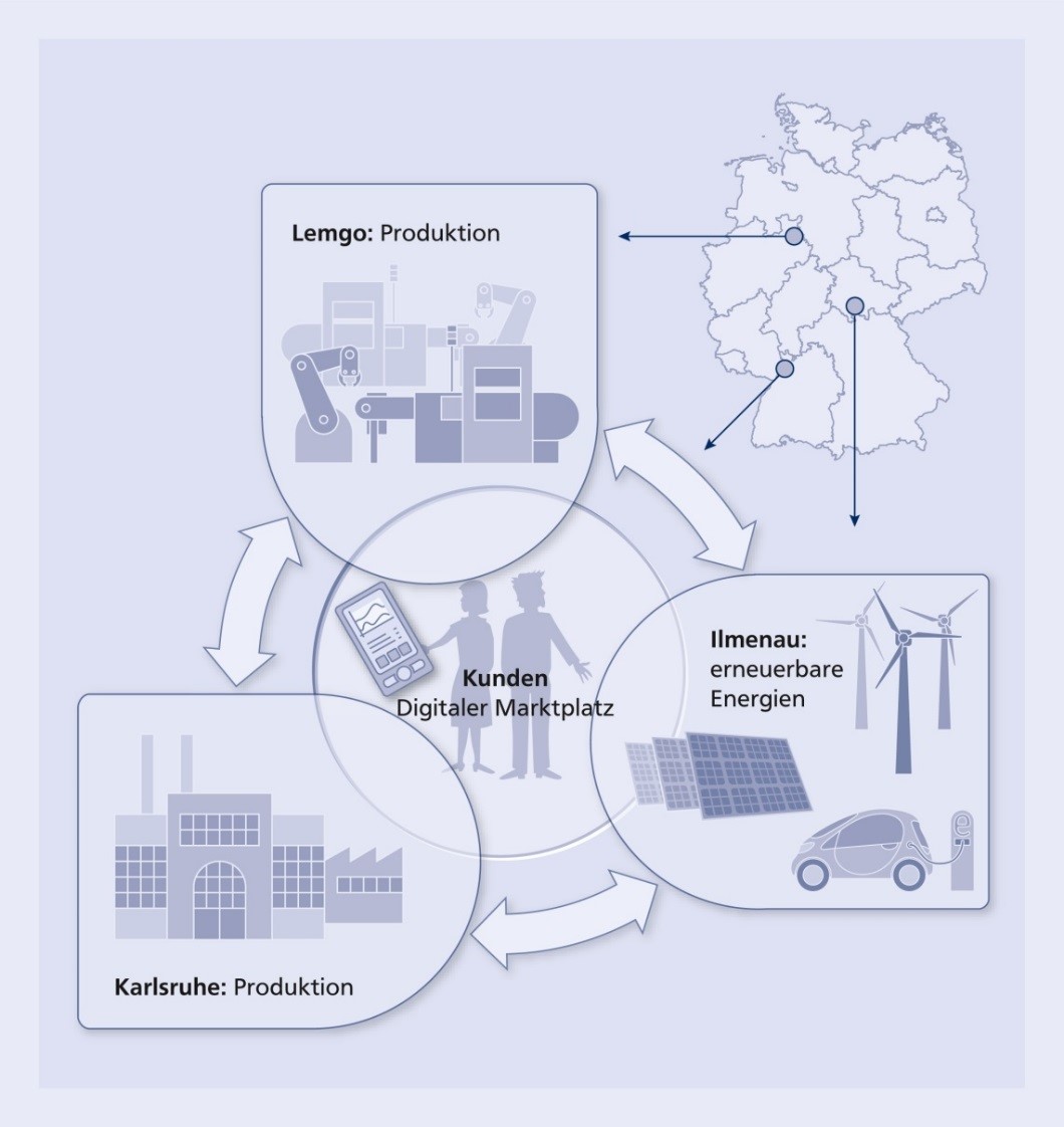 Aufbauend auf bereits an den IOSB-Standorten Lemgo und Karlsruhe vorhandenen Anlagen wird ein verteiltes, vernetztes und standortübergreifendes Produktionsnetzwerk entstehen, welches unter Einbeziehung des Standorts Ilmenau Teil eines virtuellen Smart Grids wird. Der Austausch von Produkten und Energie ist dabei virtuell, d.h. die Abläufe der Produktion und des Informationsmanagements werden synchronisiert ohne einen realen Austausch von Material und Energie zwingend zu benötigen.