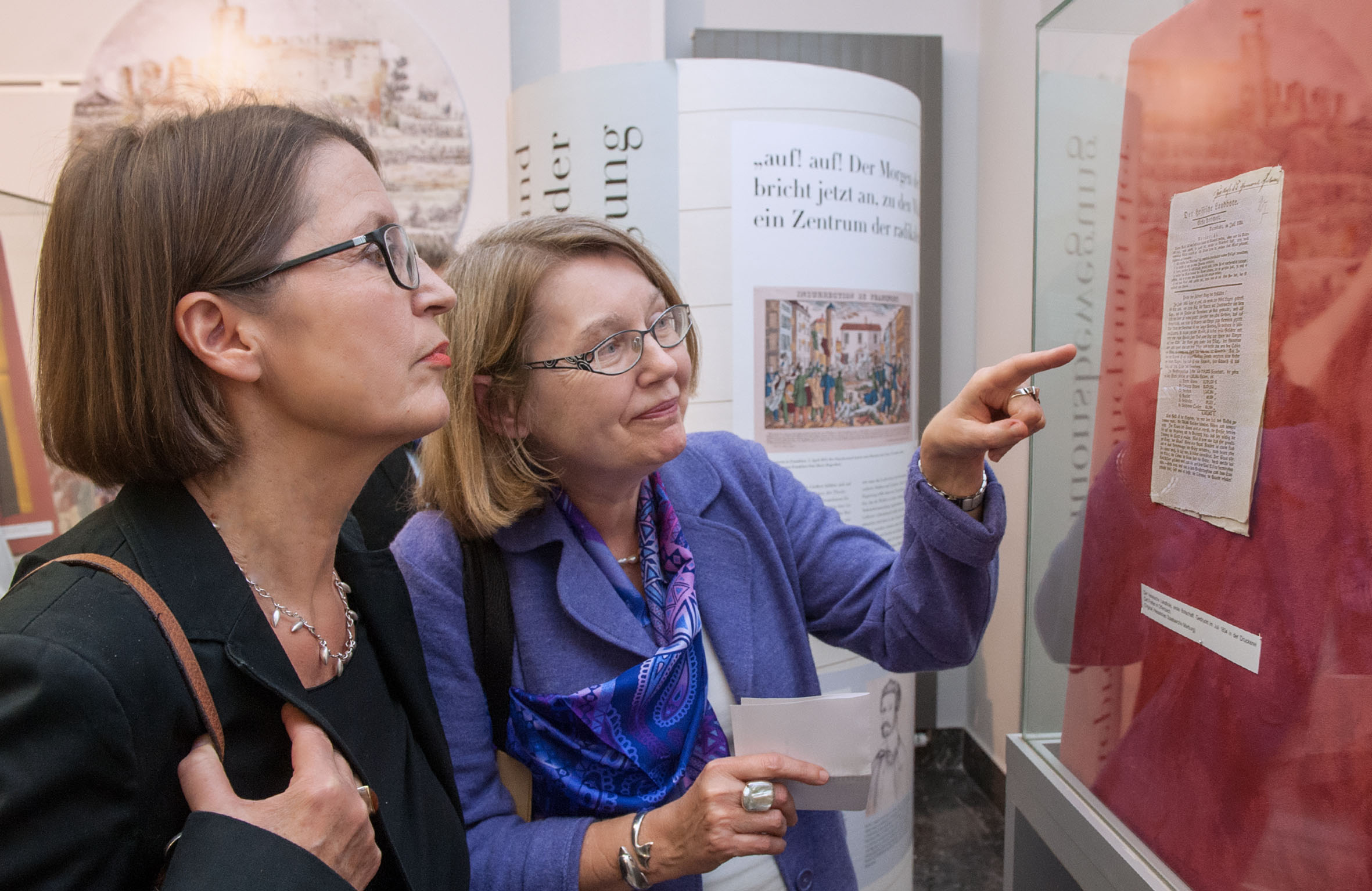 Die historische Ausstellung „Im Visier der Staatsgewalt. Die Universität Gießen als Zentrum von Revolution und Repression 1813 bis 1848“ der Justus-Liebig-Universität Gießen (JLU) wurde am Donnerstag, 31. Oktober 2013, feierlich eröffnet. Die Ausstellung ist einer der Höhepunkte des Georg-Büchner-Gedenkjahres 2013, das die Universität Gießen gemeinsam mit der Universitätsstadt Gießen feiert. Nach dem Grußwort von Prof. Dr. Peter Winker, Vizepräsident für Wissenschaftliche Infrastruktur der JLU, gab Prof. Dr. Helmut Berding, Emeritus für Neuere Geschichte am Historischen Institut der JLU, einen kurzen Überblick über den Ausstellungszeitraum, die Zeit von Restauration und Vormärz im frühen 19. Jahrhundert. Danach führten die beiden Historikerinnen Dr. Eva-Marie Felschow, Leiterin des Universitätsarchivs, und Dr. Irene Häderle, Mitarbeiterin im Universitätsarchiv, in die Ausstellung ein.
