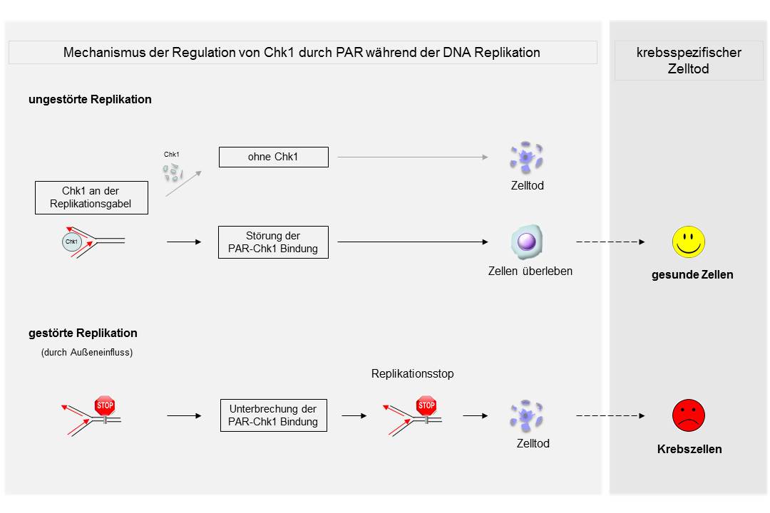 Jede Zelle mit einem Zellkern durchläuft von einer Zellteilung zur nächsten eine Abfolge von physiologischen Ereignissen, den Zellzyklus. Nach einer Zellteilung beginnt in den Tochterzellen zunächst die Interphase, in der die Zelle wächst, Zellbestandteile ergänzt werden und im Zellkern die DNA verdoppelt oder repliziert wird. Der Zeitraum, in dem die DNA synthetisiert wird, wird auch S-Phase für Synthesephase genannt. Sie wird durch genetische Signale und durch die Aktivität von Zellzyklusproteinen gesteuert. Eines davon ist das am Fritz-Lipmann-Institut untersuchte Chk1. Ist dieses Enzym in zu hoher Konzentration vorhanden, dann wird die Steuerung des Zellzyklus gestört. In der Folge wird das Erbgut während der S-Phase immer und immer wieder verdoppelt. Die Zellen wachsen unkontrolliert. Es sind Krebszellen entstanden.