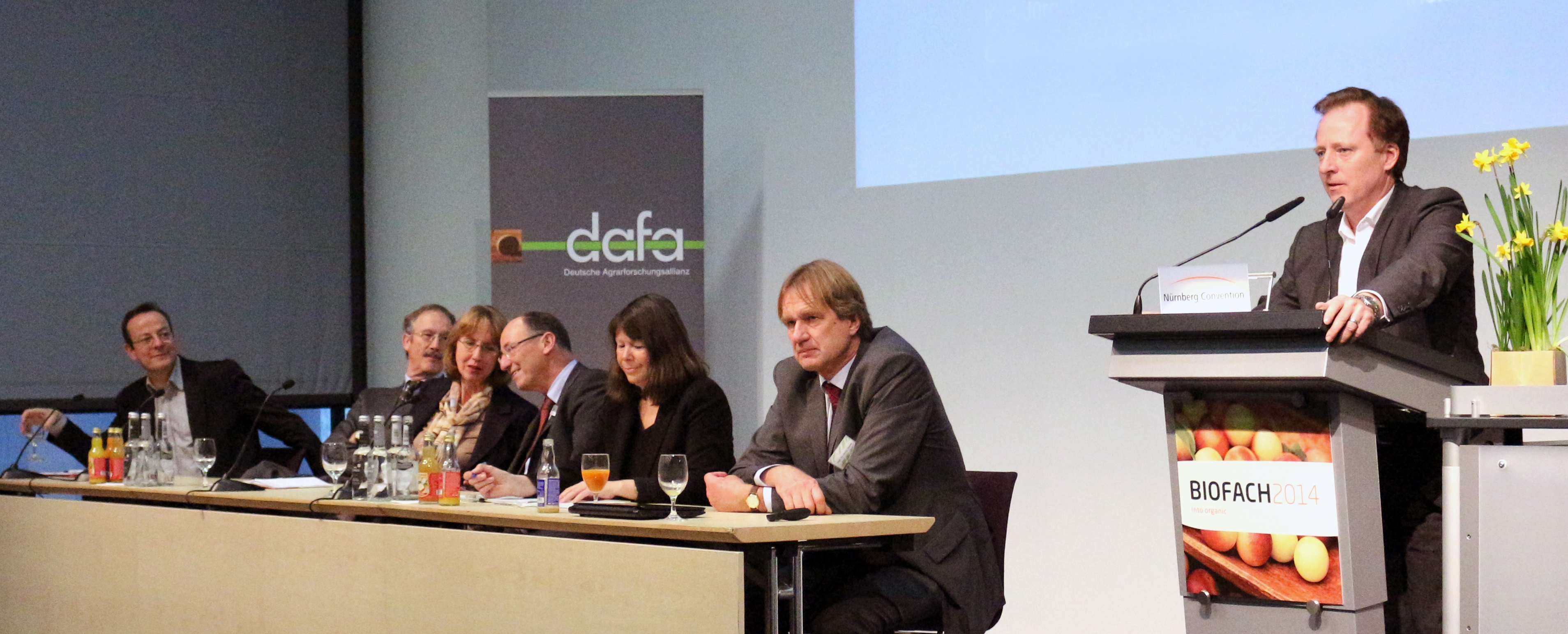 "Ökolandbau 3.0, das Leitthema der BioFach 2014, ist das alter Wein in neuen Schläuchen?", fragte Urs Niggli. Er forderte eine Innovationsstrategie, die vom bäuerlichen Wissen ausgeht, soziale Innovationen einbezieht, agrarökologische Innovationen entwickelt und aus der sich wissenschaftlich-technische Innovationen generieren lassen. Er kritisierte, dass in der Ökolandbauforschung meist nur dann kooperiert werde, wenn die EU oder nationale Geldgeber dafür Mittel bereitstellen. Das DAFA-Fachforum sei eine echte Chance, sich auch ohne externe Mittel zu Zukunfts- und Forschungsfragen auszutauschen bzw. mit vorhandenen Ressourcen Gemeinsames zu tun.