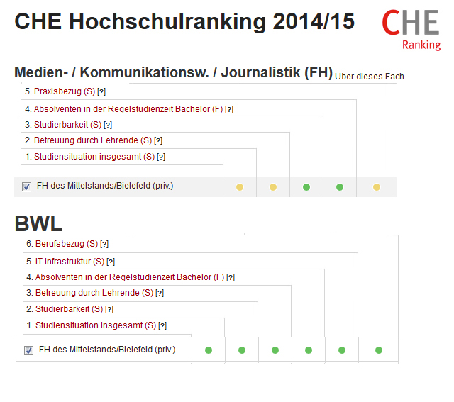 Bereits zum dritten Mal nahm die staatlich anerkannte, private Fachhochschule des Mittelstands (FHM) in diesem Jahr am CHE-Hochschulranking teil und erreichte, wie auch in den Vorjahren, hervorragende Ergebnisse. Das CHE Hochschulranking ist das umfassendste und detaillierteste Ranking im deutschsprachigen Raum, an dem mehr als 300 Universitäten und Fachhochschulen teilgenommen haben. Gerankt haben für die FHM Studierende der Wirtschafts- und Medienstudiengänge an den Standorten in Bielefeld, Köln, Pulheim, Hannover, Rostock und Schwerin.