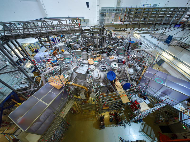 Die Anlage besteht aus fünf nahezu baugleichen Modulen, die vormontiert und in der Experimentierhalle kreisförmig zusammengesetzt wurden: 70 supraleitende Spulen, aufgefädelt auf ein stählernes Plasmagefäß, sind von einer ringförmigen Hülle umschlossen. In ihrem luftleer gepumpten Innenraum werden die Magnetspulen später mit flüssigem Helium auf Supraleitungstemperatur bis nahe an den absoluten Nullpunkt abgekühlt. So verbrauchen sie kaum noch Energie. Neben den Großkomponenten waren kilometerweise Kühlrohre, Stromleiter und Messkabel, zahlreiche Beobachtungsstutzen und Sensoren zu verbauen, stets begleitet von Kontrollvermessungen und Dichtigkeitsprüfungen der vielen tausend Schweißnähte.
