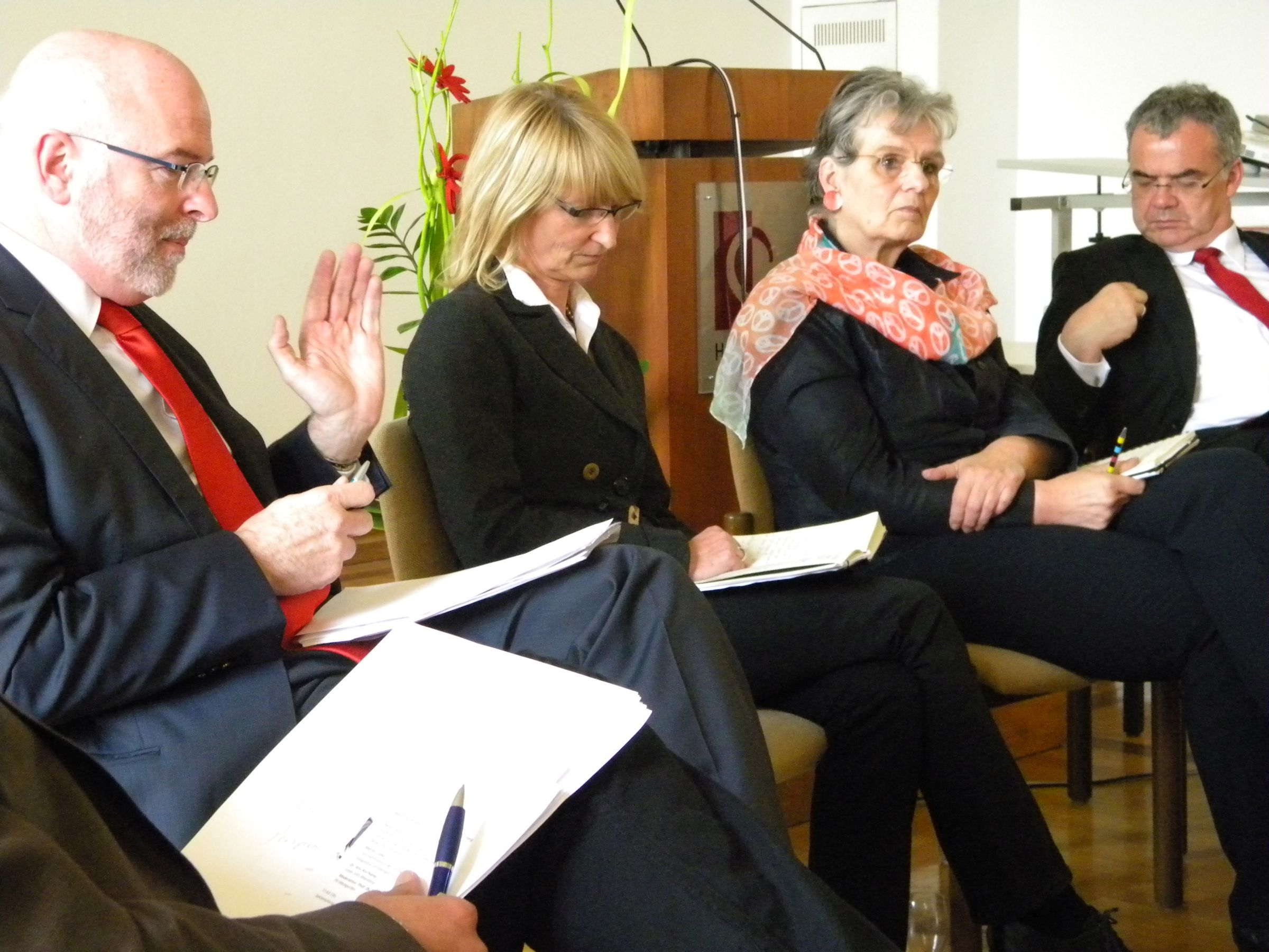 Alphabetisierung und Grundbildung waren auch Thema einer abschließenden Podiumsdiskussion mit Dr. Jörg Schmidt (Ministerialdirektor im baden-württembergischen Ministerium für Kultus, Jugend und Sport), Marianne Demmer (frühere stellvertretende GEW-Vorsitzende), Rainer Stolz (Bürgermeister der Stadt Stockach und stellvertretender Präsident des Städtetags Baden-Württemberg), Marlies Lipka (Geschäftsführerin des Fachverbands integrative Lerntherapie e.V.) und Dr. Jens Korfkamp (Leiter der VHS Rheinberg). „Wir dürfen kein Kind verlieren“, betonte Dr. Jörg Schmidt. Die Landesregierung habe sich dem Thema Alphabetisierung verstärkt angenommen und setze dabei auf Individualförderung, beispielsweise in Form von Sprachförderung im Kindergarten. Kinder mit Migrationshintergrund seien ein großes Thema, so Schmidt weiter. Auch Berufsschulen sollten durch Fördermaßnahmen erreicht werden. Wichtig sei vor allem, dass ein Förderbedarf frühzeitig erkannt werde, sagte Marianne Demmer. Nicht nur die Eltern, auch die Schulen seien hier in der Pflicht. Und für eine gezielte Förderung sollten Experten eingesetzt werden, betonte sie. „Alle Kinder profitieren davon, wenn erfahrene Therapeuten in die Schulen kommen“, sagte Marlies Lipka. Viele Eltern könnten sich eine Individualförderung nicht leisten und die eigentlichen Lehrer seien mit der Lernförderung einzelner Kinder vielfach überfordert. Für eine erfolgreiche integrative Lerntherapie seien Experten erforderlich, betonte auch sie. Die Kommunen investierten sehr viel in die Bildung und Betreuung von Kindern und Jugendlichen. „Wir setzen dabei nicht nur auf Quantität, sondern vor allem auf Qualität“, betonte Bürgermeister Rainer Stolz. Immer wieder aber gerieten Kommunen dabei an ihre finanziellen Grenzen. „Die Ausgaben in diesem Bereich sind explodiert“, so Stolz. Das Problem einer mangelnden allgemeinen Grundbildung sei von allen erkannt, aber es fehle an tragenden Konzepten und sinnvollen Strategien, kritisierte Dr. Jens Korfkamp. „Sie haben in Baden-Württemberg mit dem Masterstudiengang Alphabetisierung einen Diamanten“, betonte er. Nur durch eine Institutionalisierung dieser Experten bringe man ihn aber zum Leuchten. Auch Professorin Löffler appellierte an die Politik, Stellen für die Alphabetisierungs-Experten zu schaffen und diese in die Schulen hineinzunehmen, statt vorhandene Mittel in zu viele Projektförderungen zu investieren. Handlungsbedarf seitens der Politik mahnte PH-Rektor Professor Dr. Werner Knapp an. Man müsse dringend überlegen, in welche Richtung die Förderung gehen solle und wie man die vorhandenen Mittel für eine qualifizierte Förderung einsetzen könne. Die an der PH ausgebildeten Experten dürften nicht verlorengehen.