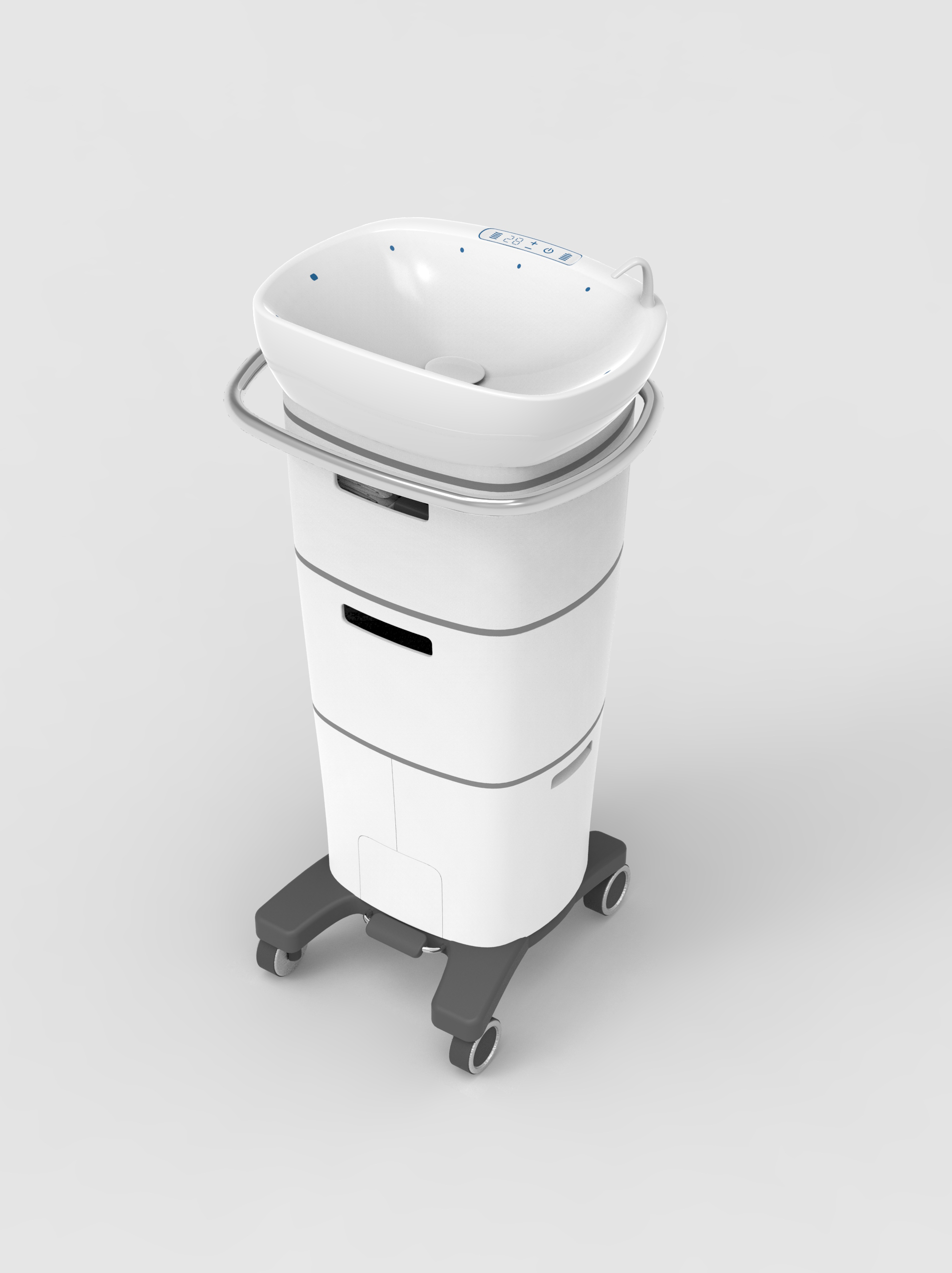 Die Konzeption des Waschwagens von Alexander Abele und Matthias Morcinek zielt darauf ab, die Waschsituation am Bett für den Pfleger und den Patienten im Krankenhaus und im Pflegeheim zu verbessern. Die angehenden Produktgestalter modernisierten den Gebrauch der Waschschüssel. Mit ihrem Waschwagen kann man fünf Patienten nacheinander schneller, ergonomischer und hygienischer versorgen.