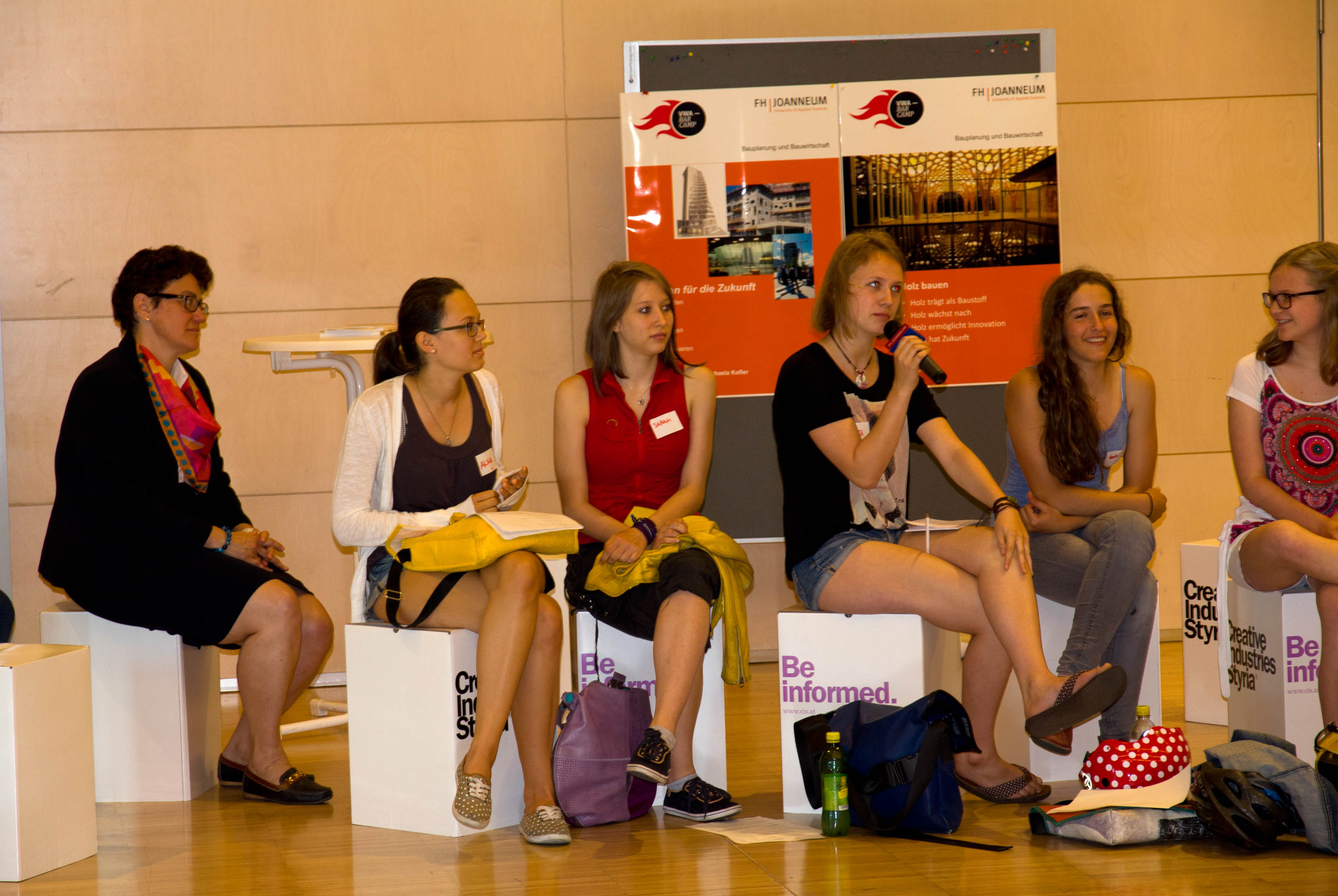 Über 50 SchülerInnen der 10. Schulstufe versammelten sich am 23. Juni 2014 im Audimax der FH JOANNEUM in Graz, um an einem Barcamp – einem Forum für offenen Wissensaustausch – zur Ideenfindung für die Vorwissenschaftliche Arbeit teilzunehmen. Wie bei einem Barcamp üblich, waren die SchülerInnen selbst gefordert, Themen einzubringen und mitzudiskutieren. Nach kurzen persönlichen Inputs und Themen-Inseln, die Lehrende der FH JOANNEUM gestaltet haben, brachten die SchülerInnen ihre eigenen Interessensgebiete und Fragenstellungen ein. Daraus wurden insgesamt 19 je halbstündige Sessions entwickelt, in denen Lehrende und Studierende die unterschiedlichen Ideen mit den SchülerInnen weiter vertieften. Der Fokus lag dabei im technischen und naturwissenschaftlichen Bereich, wobei die Themen von IT und digitale Medien über Ernährung und Konsumverhalten bis zu Microlearning und nachhaltigem Bauen reichten.