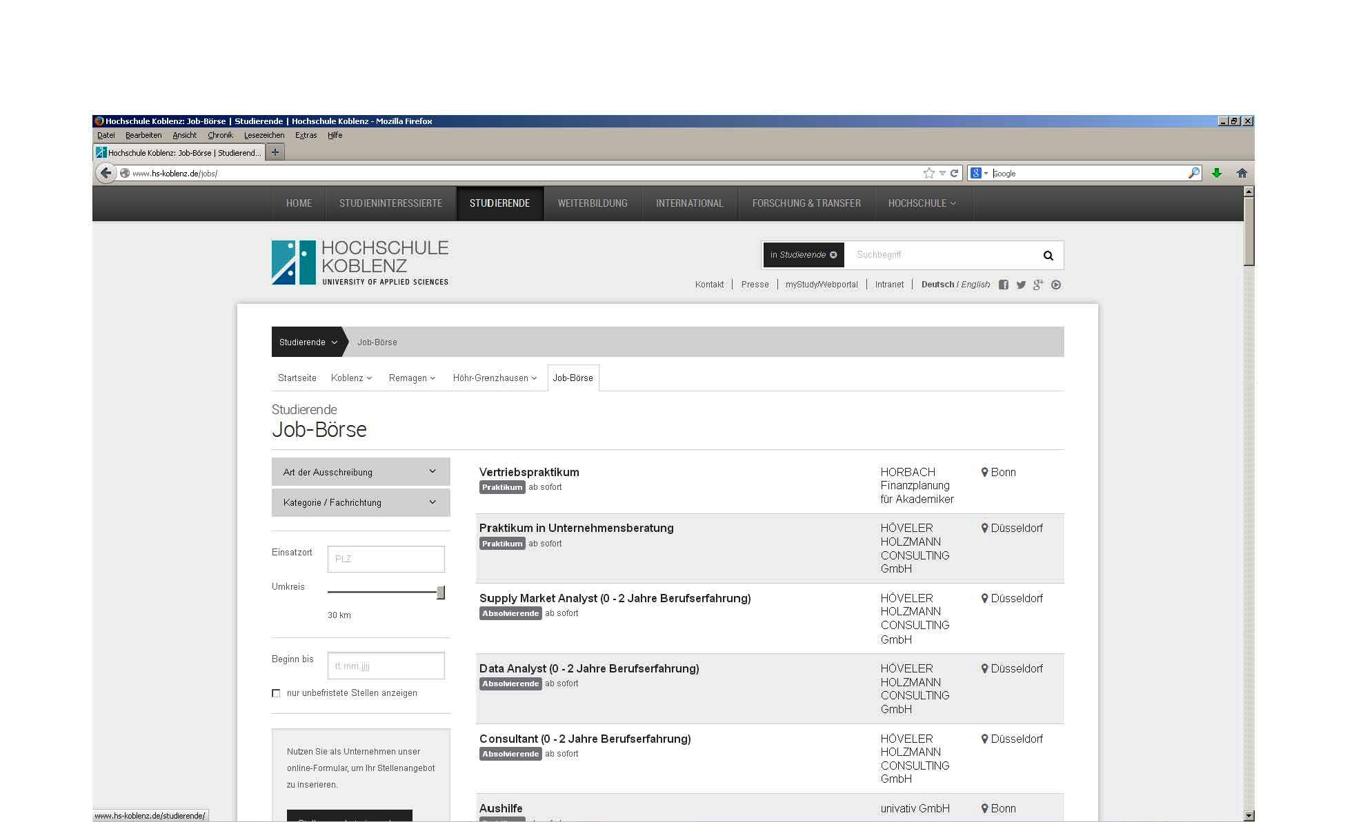 KOBLENZ/REMAGEN. Das neue Karriereportal der Hochschule Koblenz ist jetzt online. Unternehmen können in dem Portal kostenfrei Ausschreibungen für Praktika, Abschlussarbeiten, Nebenjobs und Berufseinstiegsstellen veröffentlichen und ihr Unternehmen präsentieren. Studierende können online Stellenangebote suchen und gezielt nach Jobs aus ihrer Studienrichtung suchen. Auch Hochschulangehörige können sich in dem Portal einen Überblick über die angebotenen internen Stellen verschaffen.