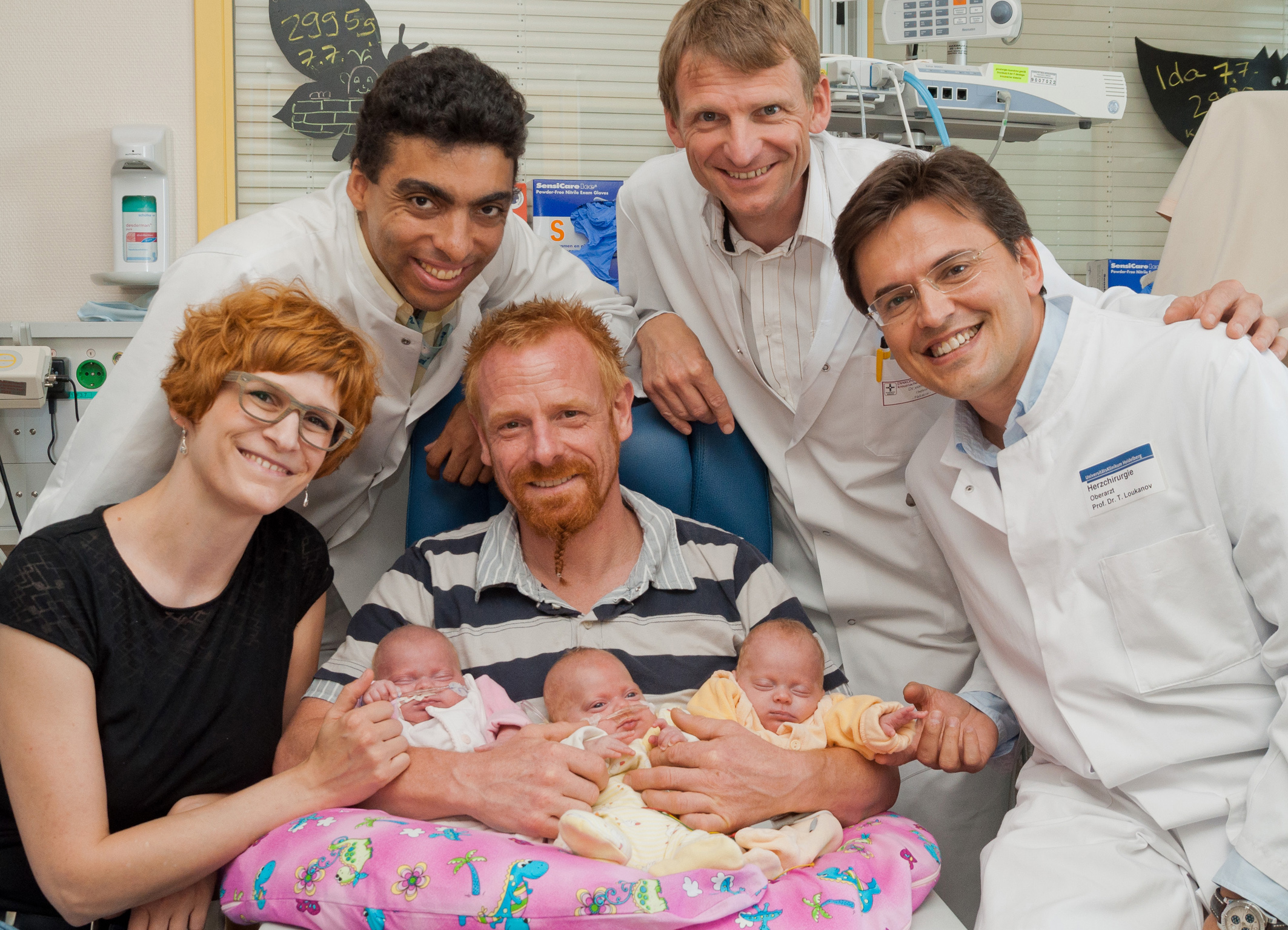 Drei erfolgreiche Notoperationen an den Herzen frühgeborener Drillinge an einem Abend – selbst für den erfahren Kinderherzchirurgen Professor Dr. Tsvetomir Loukanov von der Sektion Kinderherzchirurgie am Universitätsklinikum Heidelberg sind diese kleinen Patientinnen etwas ganz Besonderes: Am 20. März 2014 kommen die Mädchen in der 25. Schwangerschaftswoche per Notkaiserschnitt im Diakonie-Krankenhaus Bad Kreuznach zur Welt. Regulär hätten sie noch bis Anfang Juli Zeit gehabt. Jedoch wurde die Kleinste, Süske, nicht mehr ausreichend versorgt. Sie wiegt bei der Geburt 470 Gramm bei 29 Zentimetern – der Name „Süske“ bedeutet kleine Schwester. Ida wiegt 550 Gramm bei 29 Zentimetern und Hannah ist mit 580 Gramm bei 31 Zentimetern die Größte. Alle drei Mädchen haben einen für Frühgeborene typischen Herzfehler, bei dem noch Querverbindungen zwischen Körper- und Lungenkreislauf vorliegen.