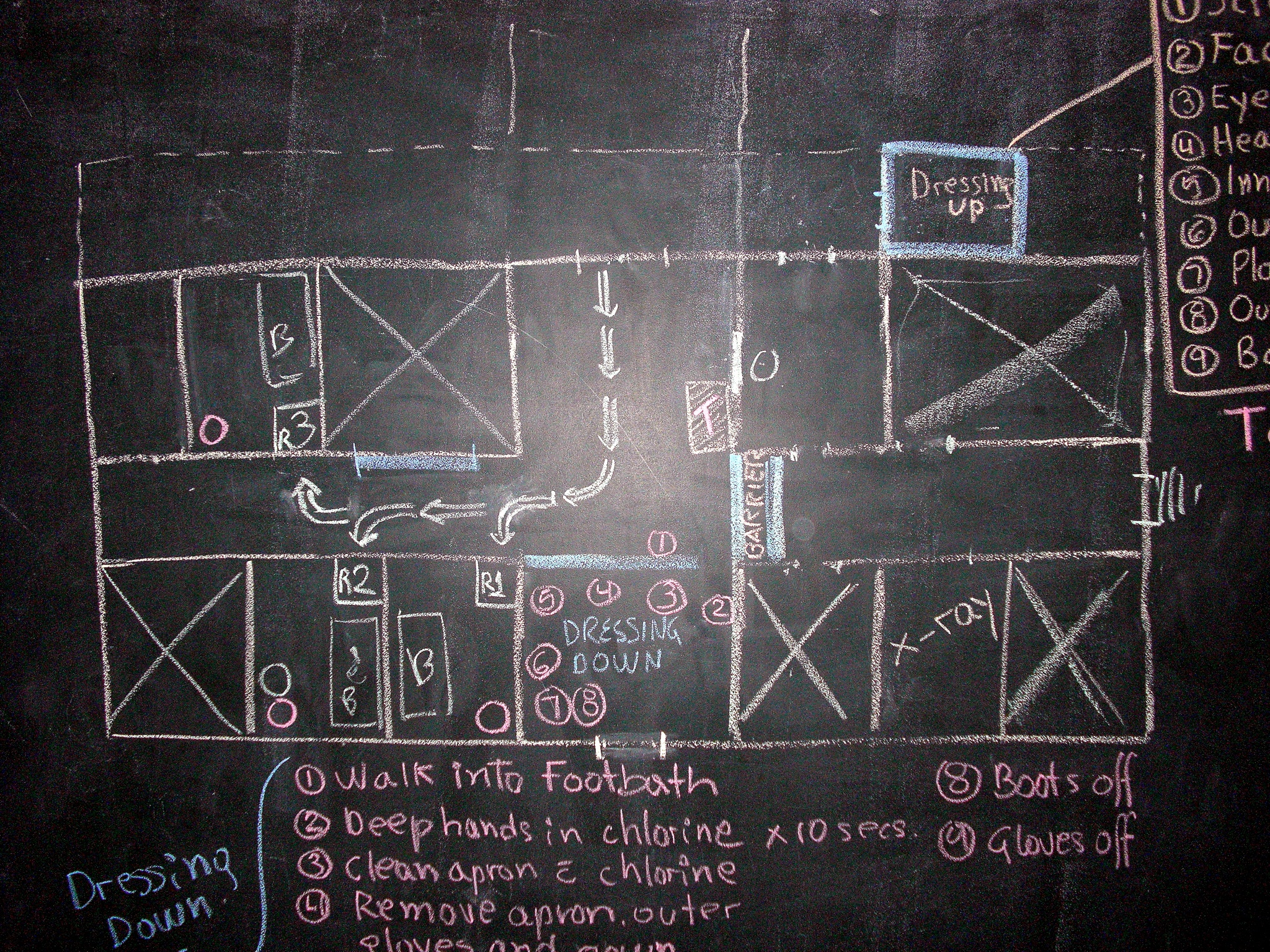 Die Station verfügt über einen reinen Eingang und einen Ausgang. Betreten werden darf sie nur im vollen Schutzanzug, die Desinfektion erfolgt hauptsächlich mit Chlor. Bei der Reinigung stehen die Ärzte und Pflegenden mit den Füßen in Eimern, selbst die bis zu drei paar Handschuhe, die gleichzeitig getragen werden müssen, müssen aufwändig nacheinander desinfiziert und entsorgt werden. „Besonders schwierig ist es, die Brille abzunehmen oder die Stiefel auszuziehen, ohne dabei kontaminierte Bereiche zu berühren oder die Hände zu benutzen.“ Doch auch dafür entwickelten die Wittener Studenten effiziente Methoden.
