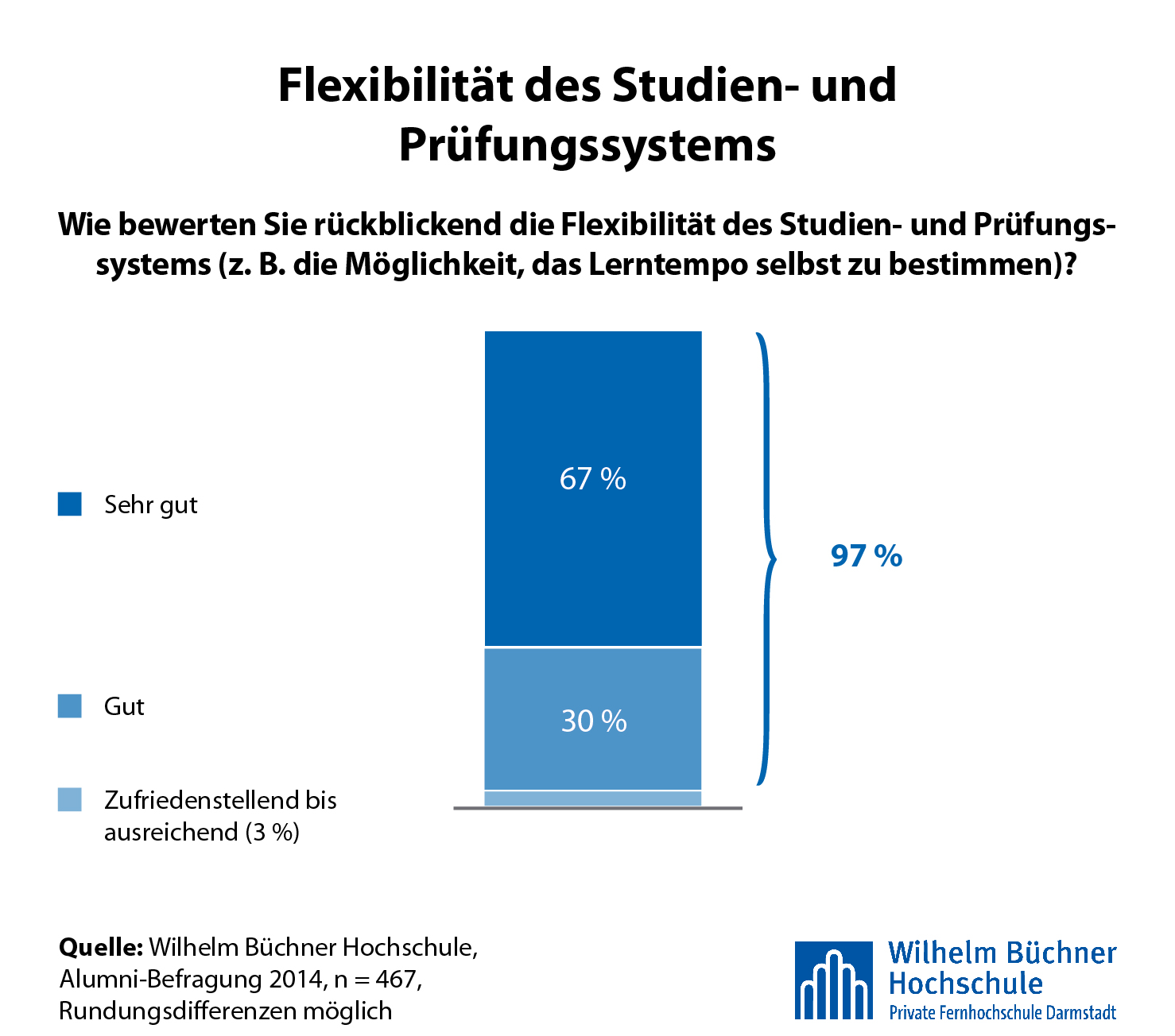 Die Wilhelm Büchner Hochschule bietet ein flexibles Studien- und Prüfungssystem, unter anderem mit der Möglichkeit, das Lerntempo selbst zu bestimmen. 97 Prozent der befragten Absolventen bewerteten dieses System rückblickend als sehr gut bis gut. „Flexibles Zeitmanagement bedeutet für jeden unserer Studierenden etwas anderes“, erklärt Thomas Kirchenkamp, Kanzler der Wilhelm Büchner Hochschule. „Während der eine das Lernpensum monats- oder quartalsweise an die Auftragslage des Arbeitgebers anpassen möchte, ist es für den anderen wichtig, bestimmte Termine aus dem Familienalltag berücksichtigen zu können. Der nächste möchte vor allem sein persönliches Leistungshoch in den frühen Morgenstunden für das Lernen nutzen.“