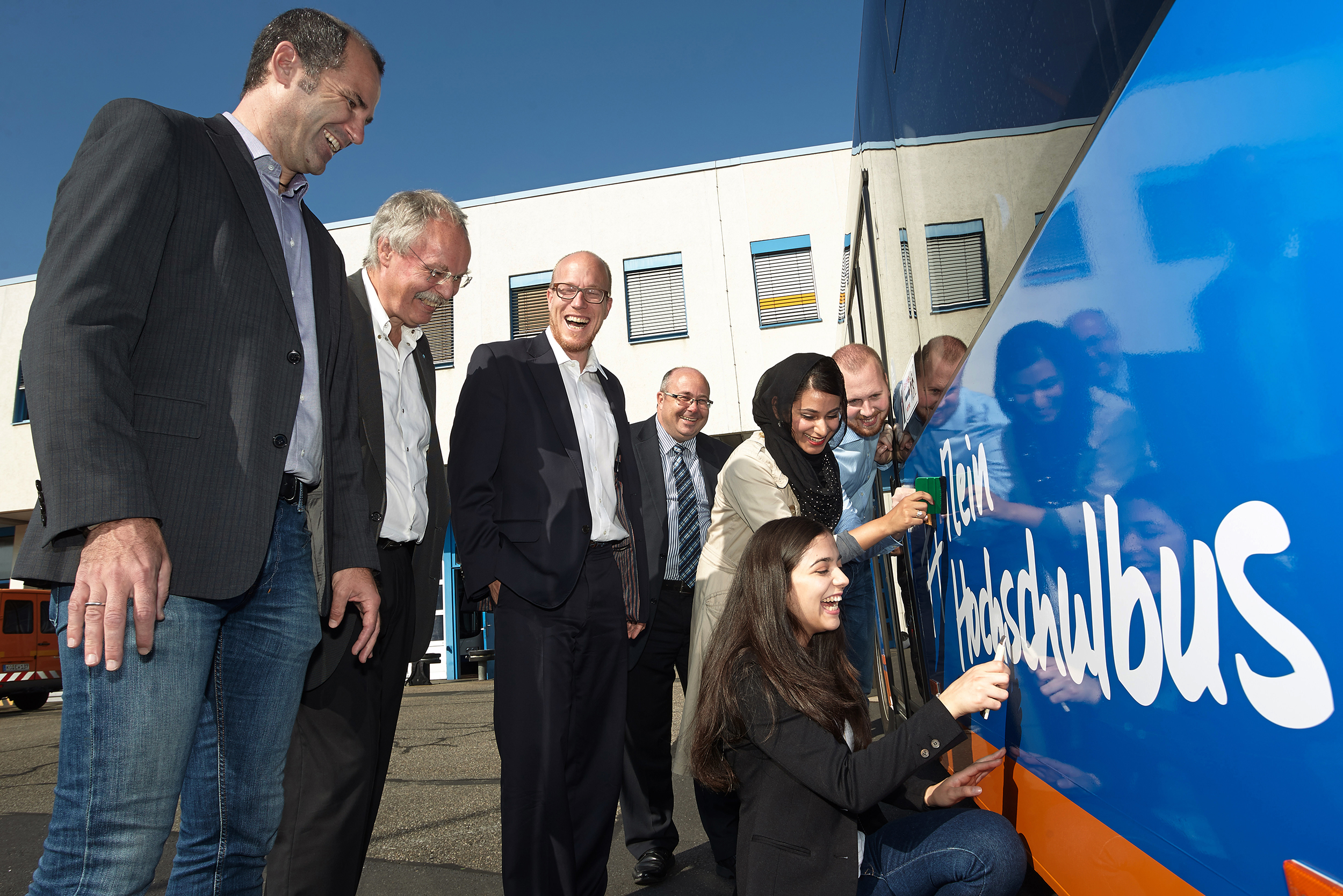 „Die Jury hatte sich für das Motiv „#Mein Hochschulbus“ entschieden, weil hier die 3-Sekunden-Regel konsequent eingehalten wird und sich die Botschaft schon beim Vorbeifahren des Busses transportiert“, erläutert Prof. Dr. Holger J. Schmidt. Davon können sich bald Studierende und andere Verkehrsteilnehmer überzeugen: „#MeinHochschulbus“ wird ab dem Semesterstart am 29. September unter anderem auf der Strecke zwischen Hauptbahnhof und dem RheinMoselCampus eingesetzt.
