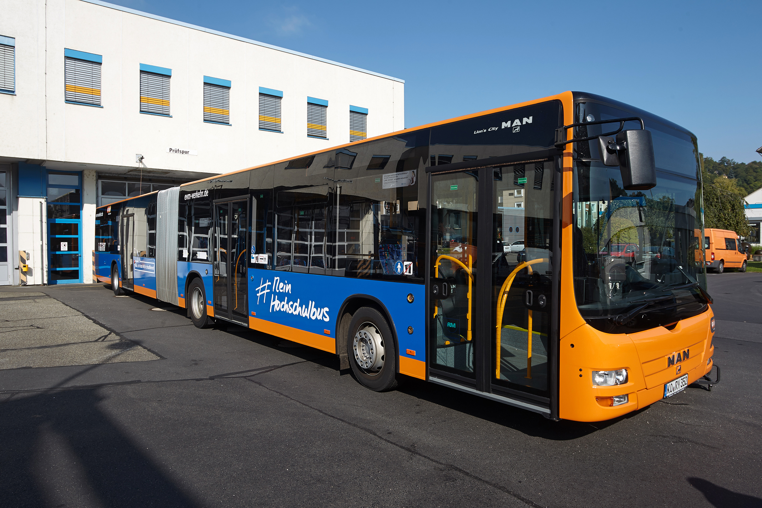 Im Frühjahr hatten Marketingstudierende der Hochschule Koblenz im Rahmen der englischsprachigen Vorlesung „Marketing Communications“ unter dem Arbeitstitel „Mit dem Bus zur Hochschule“ Ideen für die passende Gestaltung eines Linienbusses entwickelt. Die Jury, bestehend aus Vertreterinnen und Vertretern der Hochschule Koblenz, der damaligen KEVAG Verkehrs-Service GmbH und des Studierendenwerks Koblenz, hatte sich für den Entwurf „#Mein Hochschulbus“ der drei Studierenden entschieden. Die Partner wollen mit ihrer besonderen Marketingkooperation insbesondere Studierende dazu motivieren, das Auto nach Möglichkeit öfter stehen zu lassen und sich zur Hochschule fahren zu lassen – so wie es der Slogan „Also, ich lass mich chauffieren!“ vermittelt.