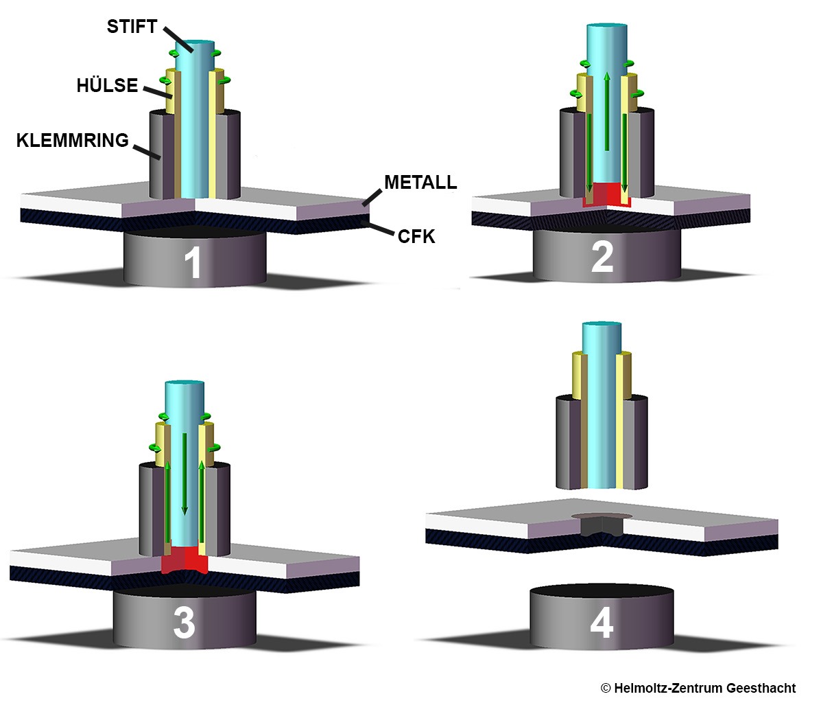 Beim FSpJ von Metall und CFK dringt eine sich schnell drehende Hülse nur in die Metallschicht ein. Durch die Reibungshitze werden das Metall weich und das CFK an der Oberfläche aufgeschmolzen. Beim Zurückziehen der drehenden Hülse kommt es zu einer leichten Verformung des CFK in das Metall hinein. Am Ende entstehen so in der sogenannten Übergangszone des CFK eine Verklebung und eine mechanische Verankerung (siehe Abbildung).