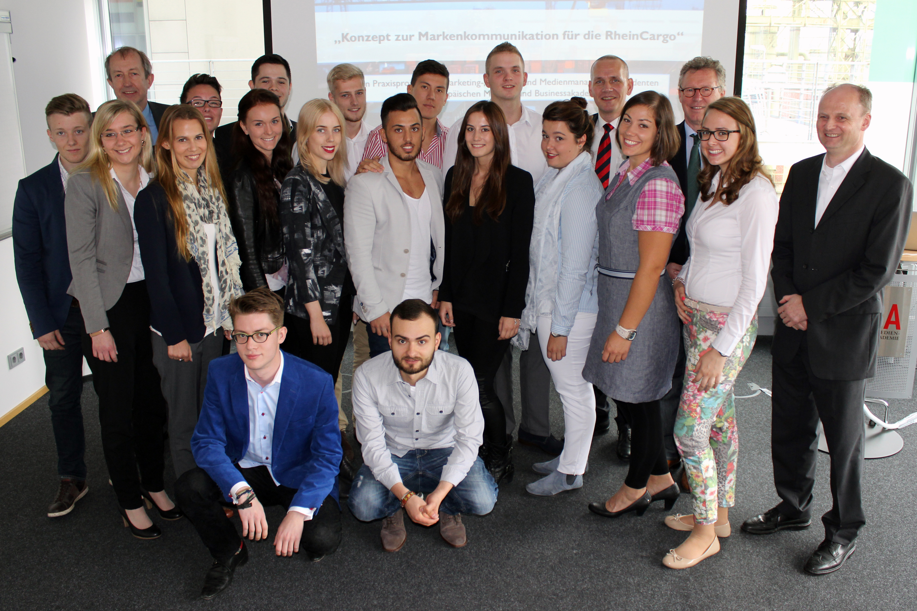 Ihr großer Einsatz während der Projektphase wurde bei der abschließenden Präsentation vor dem Kunden gebührend honoriert. „Ich muss Ihnen ein großes Lob aussprechen! Sie haben trotz des Zeitlimits ganz hervorragend gearbeitet. Gerade bei der Entwicklung des Slogans haben Sie hervorragende Ansätze gefunden. Das hat Agenturqualität“, lobt Rainer Schäfer, Geschäftsführer der RheinCargo, die Projektarbeit der Studierenden.