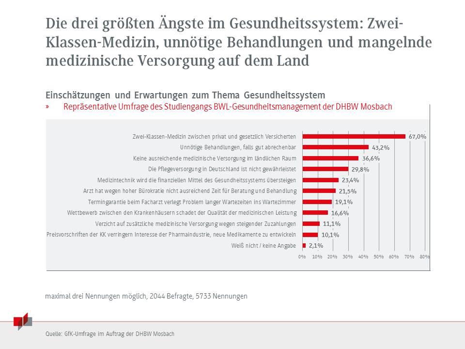 Das prägnanteste Ergebnis der Befragung: 67 Prozent der Teilnehmer gaben an, dass sie eine Zwei-Klassen-Medizin zwischen privat und gesetzlich Versicherten befürchten. Bei Haushalten mit drei Kindern oder mehr sind es sogar 71 Prozent. „Diese Einschätzung ist zwar keinesfalls ein Hinweis auf die tatsächliche Existenz einer Zwei-Klassen-Medizin“, so Prof. Dr. Tobias Lutz, der im Studiengang BWL-Gesundheitsmanagement an der DHBW Mosbach lehrt, „aber bedenklich finde ich, dass diese Zahlen wie auch die anderen Umfrageergebnisse belegen, dass der Wandel im Gesundheitssystem die Menschen in allen Lebenssituationen und Versorgungsbereichen verunsichert.“