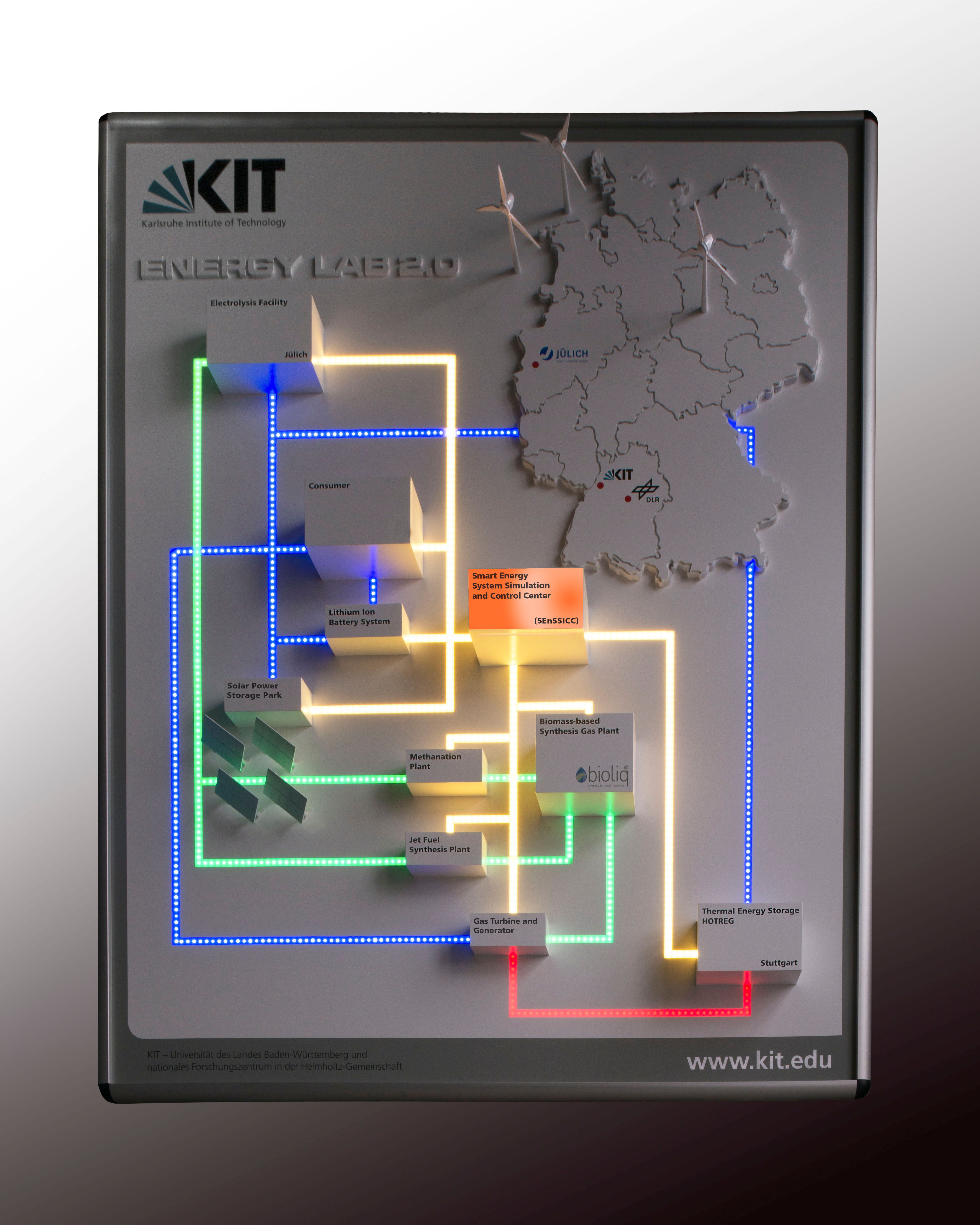 Der Anlagenverbund verknüpft charakteristische Komponenten zur Strom-, Wärme- und Synthesegaserzeugung mit verschiedenen Energiespeichertechnologien und Verbrauchern. Dazu werden vorhandene große Versuchseinrichtungen am KIT in das Energy Lab 2.0 integriert: der Solarstrom-Speicher-Park, die bioliq-Pilotanlage und ausgewählte Energieverbraucher am KIT-Campus Nord. Elektrische, elektrochemische und chemische Speicher sowie eine last- und brennstoffflexible Gasturbine mit Generator werden als neu zu schaffende Komponenten den Anlagenverbund ergänzen. Ein Simulations- und Kontrollzentrum am KIT verknüpft alle Komponenten des Anlagenverbundes am KIT und der Partner über Informations- und Kommunikationstechnologien zu einem intelligenten Gesamtsystem („Smart Energy System“). In der Kombination ist diese Infrastruktur die erste ihrer Art in Europa.