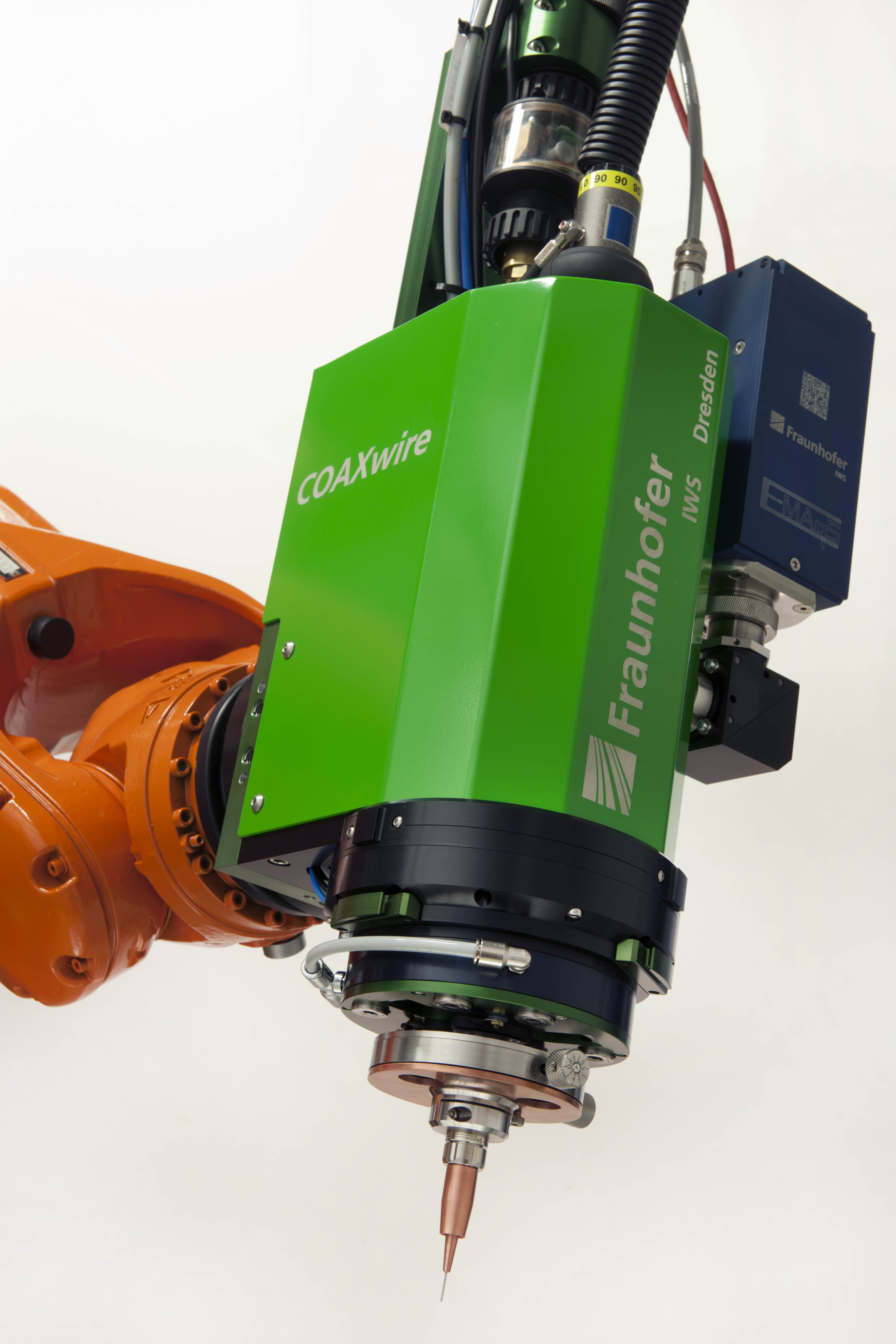 Die neue Laser-Draht-Koaxialbearbeitungsoptik COAXwire aus dem Fraunhofer IWS Dresden ist für die Verwendung von handelsüblichen Massiv- und Fülldrähten ausgelegt und kompatibel zu Standard-Drahtförderern aus dem Bereich der Schweißtechnik. Sie beinhaltet eine Kollisions- und Sicherheitsabschaltung zum Schutz vor Beschädigungen bei Fehlfunktionen oder Prozessunregelmäßigkeiten. Die kompakte Bauweise ermöglicht eine einfache Integration in CNC-Maschinen und Robotersysteme.