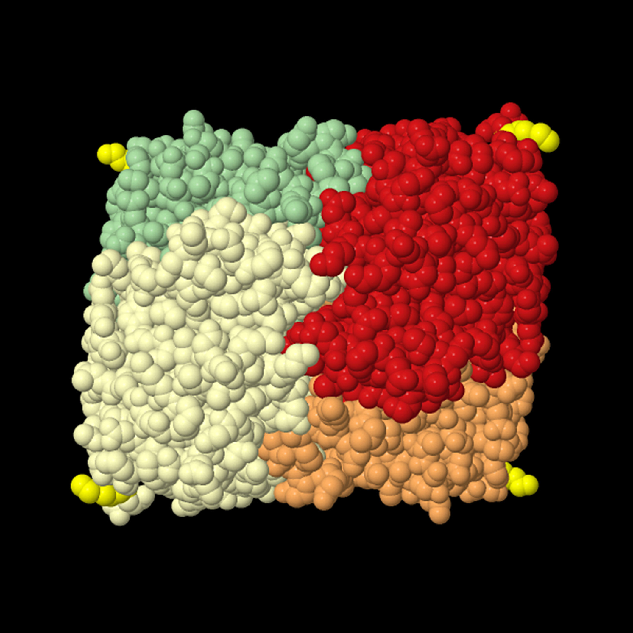 Abb.1: Lactatdehydrogenase (LDH) ist ein altbekanntes Enzym, das aus vier Untereinheiten besteht, die hier in grün, rot, beige und orange dargestellt sind. Forscher an der UMG haben herausgefunden, dass diese Untereinheiten an den gelb markierten Enden Anhängsel bekommen können, mit deren Hilfe LDH ins Peroxisom transportiert wird. Diese Anhängsel mit der Adressierung für Peroxisomen entstehen, indem bei einem Teil der LDH das Stopp-Codon überlesen wird. Abbildung: aus Schueren et al. eLife 2014;3:e03640.