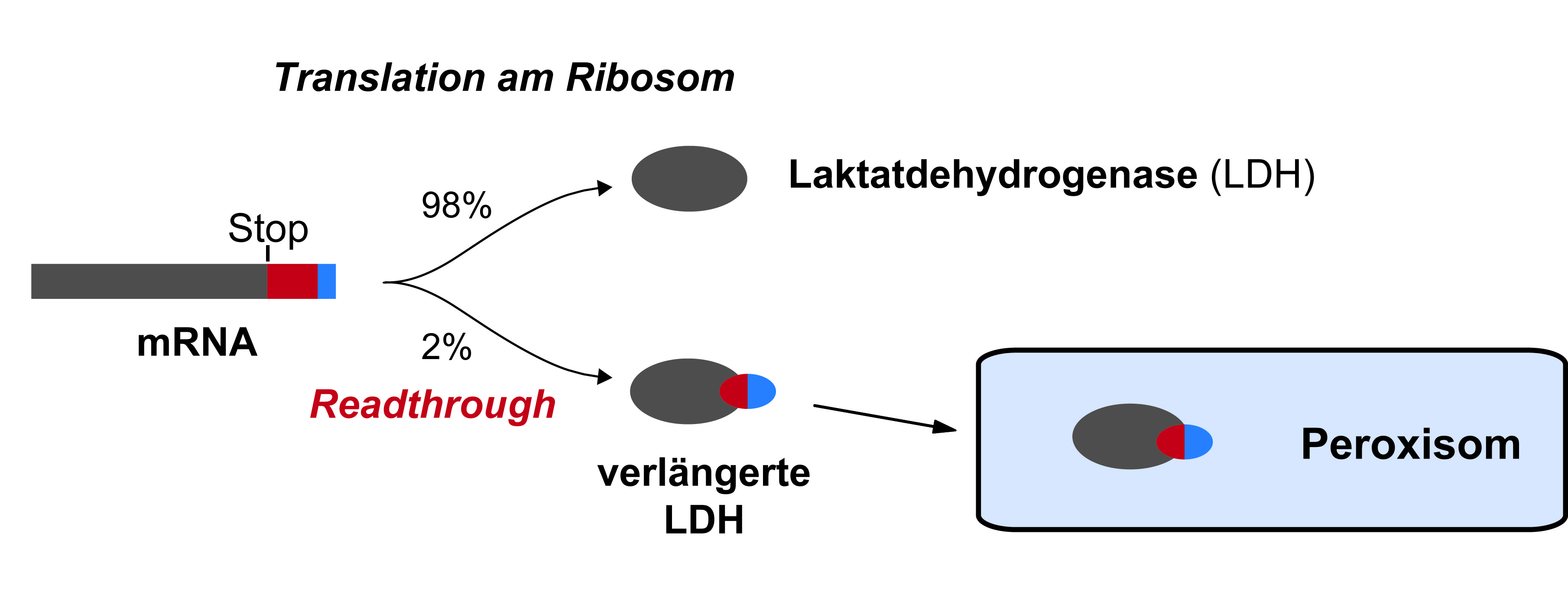 Abb. 2: Auf der Boten-RNA (mRNA) ist die Information für alle Proteine kodiert. Bei der Proteinherstellung (Translation) werden die Information der mRNA in jeder Körperzelle in Protein übersetzt. Ein Stopp-Codon auf der mRNA signalisiert normalerweise das Ende der Translation. Thoms und Kollegen erkannten, dass bei ca. 2% aller Laktatdehydrogenase (LDH)-Moleküle das Stopp-Codon überlesen wird (readthrough). Dadurch bekommt die LDH ein kleines Anhängsel, das die Adressierung für ein Zellorganell enthält, das sich in jeder Körperzelle befindet: das Peroxisom. So kann die Zelle sicherstellen, dass immer ein bestimmter Anteil der LDH in das Peroxisom gelangt und dort aktiv sein kann. Schema: umg/Thoms