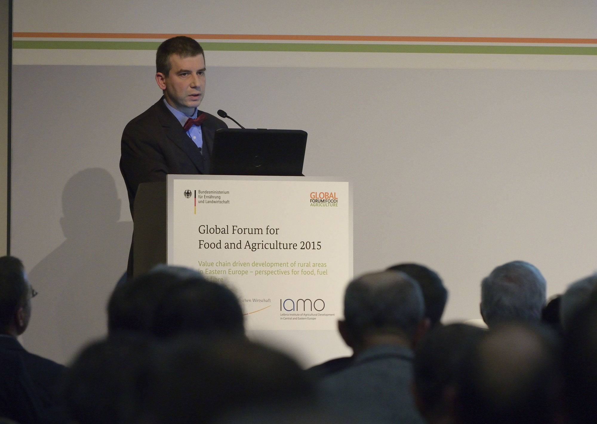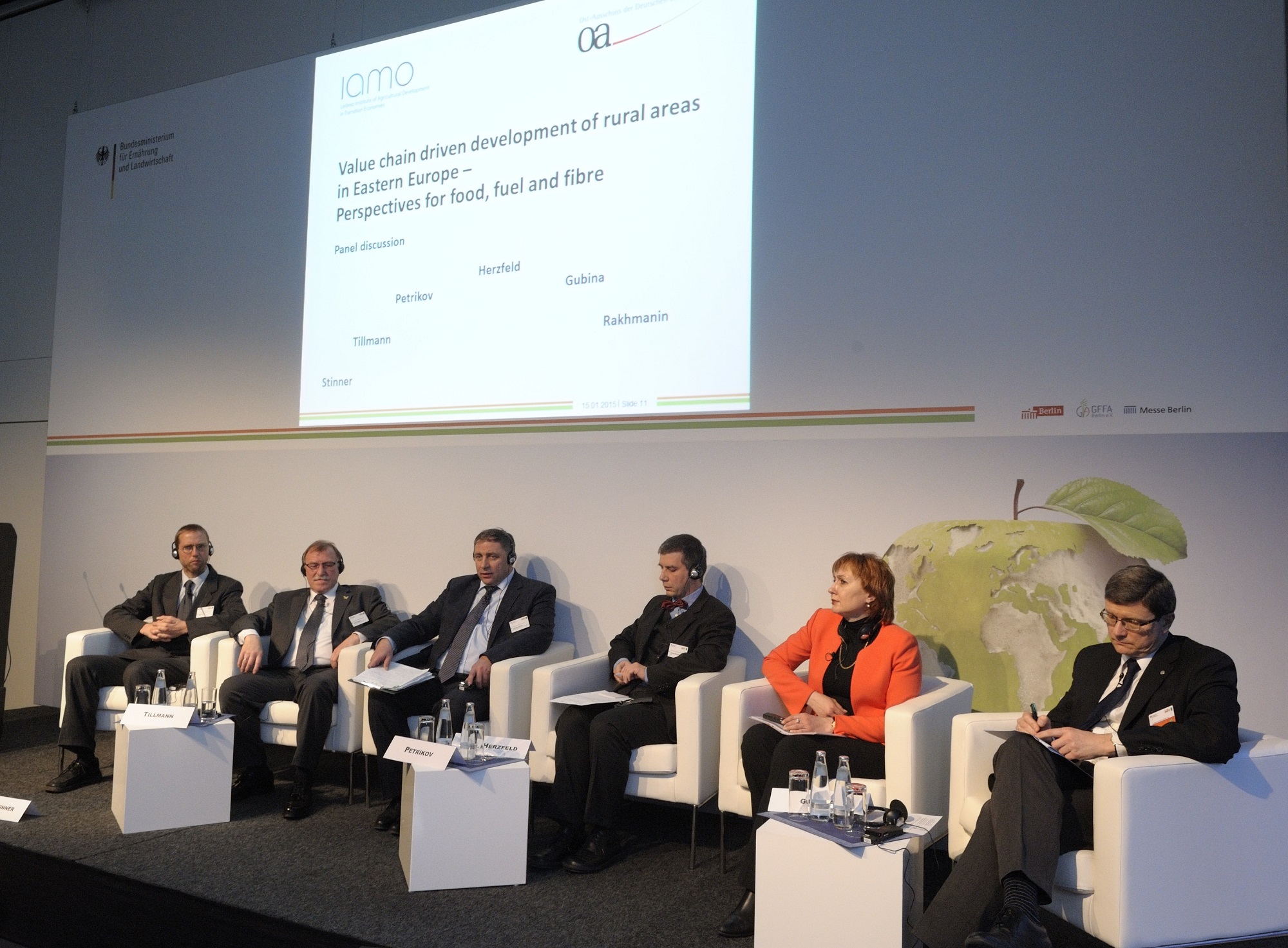 Mehr als 150 Gäste besuchten das Fachpodium "Wertschöpfungskettenorientierte Entwicklung ländlicher Regionen in Osteuropa – Perspektiven für die Produktion von Nahrungsmitteln, Energie und technische Rohstoffe", welches das Leibniz-Institut für Agrarentwicklung in Transformationsökonomien (IAMO) gemeinsam mit der Arbeitsgruppe Agrarwirtschaft im Ost-Ausschuss der Deutschen Wirtschaft (OA) am 15. Januar in Berlin ausrichtete. Die Veranstaltung war Teil des Global Forum for Food and Agriculture 2015 (GFFA), das jährlich im Rahmen der Internationalen Grünen Woche unter Federführung des Bundeslandwirtschaftsministeriums veranstaltet wird.