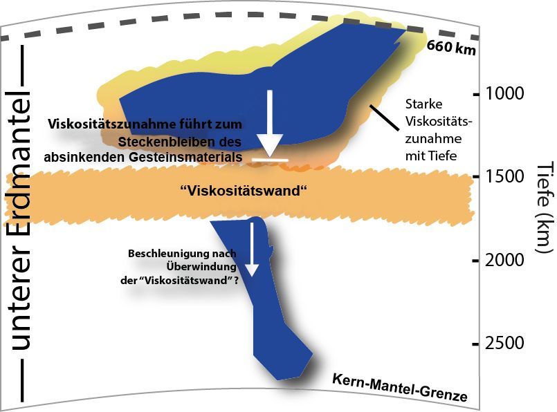 Falls es einigen Gesteinsmassen dennoch gelingt, diesen Riegel zu überwinden, dürfte sich ihre Abwärtsbewegung wieder beschleunigen. Denn wie andere geowissenschaftliche Studien gezeigt haben, verringert sich die Viskosität im unteren Erdmantel ab einer Tiefe von etwa 1.700 Kilometern. Unter dieser Voraussetzung kann Gestein aus der Kruste, sobald es unterhalb der hochviskosen Schicht angekommen ist, bis tief in den unteren Erdmantel und weiter bis zum Erdkern vordringen.