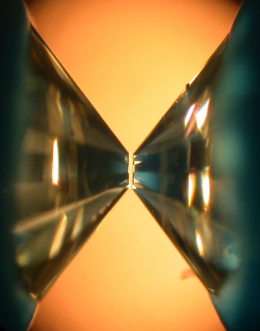 Wie sind die Geowissenschaftler in Bayreuth und den USA auf die Existenz einer hochviskosen Erdschicht gestoßen? Empirische Materialuntersuchungen „vor Ort“ sind im unteren Erdmantel unmöglich. Doch mithilfe von Diamantstempelzellen können im Bayerischen Geoinstitut winzige Gesteinsproben extrem hohen Drücken ausgesetzt werden, wie sie im Erdinneren herrschen. Dabei wird jede Probe von zwei einander gegenüberliegenden Diamanten zusammengepresst, die an ihrer Spitze nicht viel breiter sind als ein menschliches Haar. Auf diese Weise haben Marquardt und Miyagi mehrere tausend Ferroperiklas-Kristalle steigenden Drücken unterworfen: beginnend mit 20 Gigapascal, die an der Grenze zwischen dem oberen und dem unteren Erdmantel herrschen, bis hin zu fast 100 Gigapascal, wie sie im unteren Erdmantel in rund 2.200 Kilometern Tiefe gegeben sind. Zum Vergleich: Würde man den Eiffelturm in der Handfläche balancieren, entstünde dabei ein Druck von 10 Gigapascal.