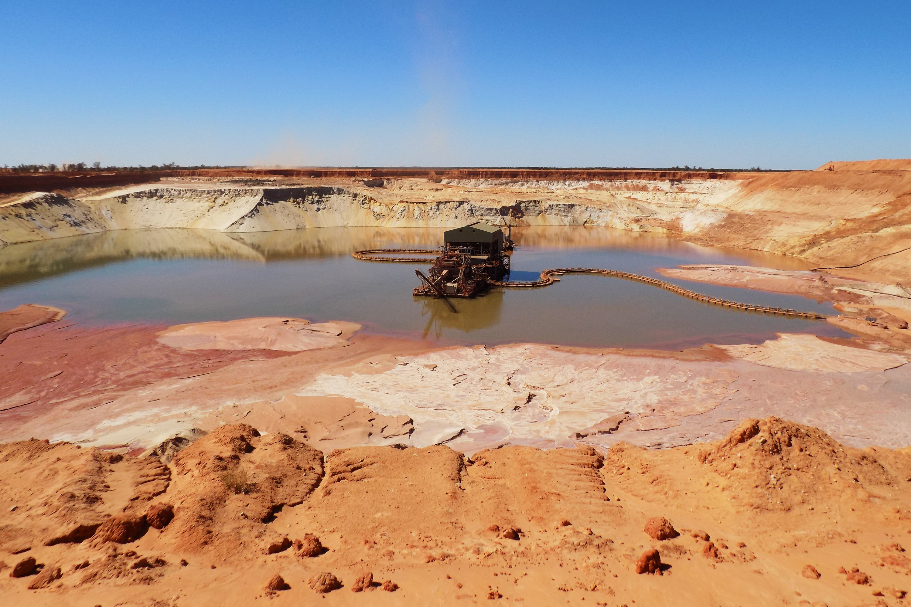 Das Kupfer- und Uranerzbergwerk Olympic Dam in Roxby Downs beispielsweise, das die TFH-Gruppe durch eine Grubenfahrt näher kennenlernte, gehört gemessen an der Produktionsmenge zu den drei größten Untertagebergwerken weltweit. Neben solchen allein durch die Größe beeindruckenden Betrieben lernten die Studierenden aber auch Abbautechnologien für besondere Industriemineralien kennen: Im Murray-Becken bei Mildura werden aus Dünensanden titanhaltige Schwerminerale für die Produktion von Farbpigmenten und speziellen Werkstofflegierungen gewonnen . Auf einem künstlichen See löst ein Schwimmbagger die Sande, die direkt der gleichfalls schwimmenden Aufbereitung zugeführt werden. Mit Hilfe von Wasser und durch die unterschiedliche Dichte trennt man die begehrten Titanverbindungen vom gewöhnlichem Sand. Weitere Befahrungen führten die Bochumer Studierenden in Gold, Silber, Eisenerz, Braunkohle und Opal fördernde Betriebe.
