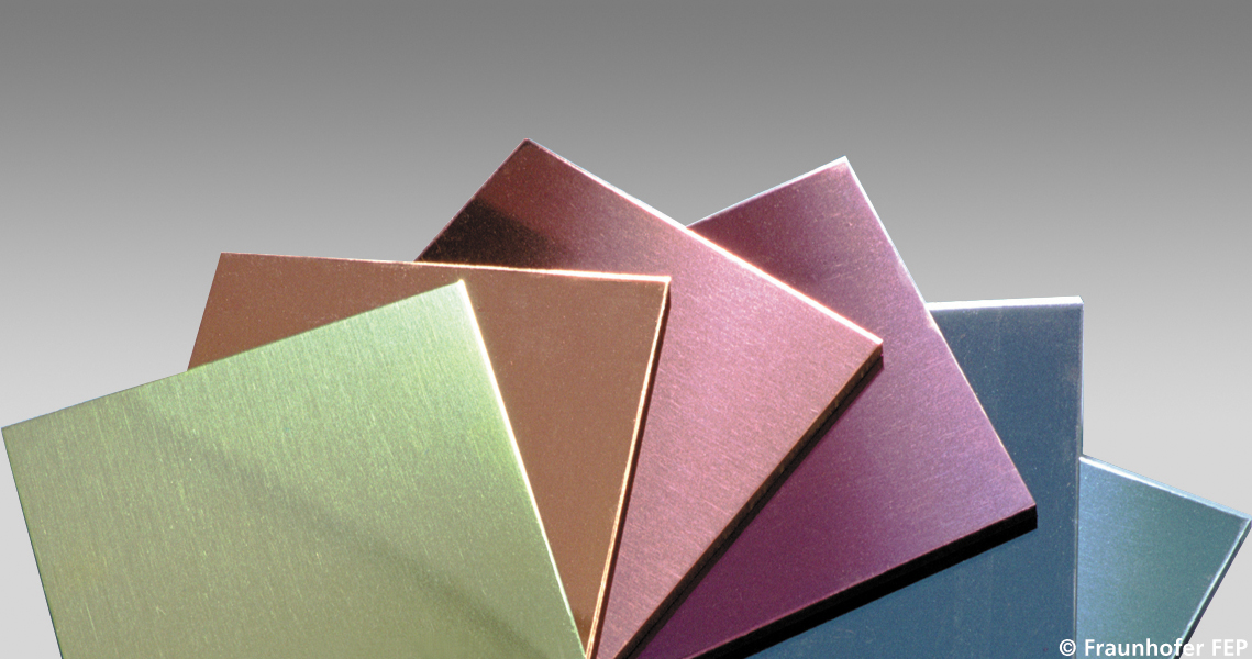 Im Gegensatz zu solchen Farben, die im Material von Nitrid- oder Carbidschichten aufgrund von Lichtabsorption hervorgerufen werden, basieren sogenannte Interferenzfarben auf dünnen und durchsichtigen Oxidschichten (wie beispielsweise aus Titanoxid). Sie bringen besonders brillante Farben hervor. Den Interferenzeffekt kennt man von Ölfilmen auf einer Pfütze, die in den unterschiedlichsten Farben im Sonnenlicht schimmern. Je nach gewünschter Farbgebung können die Wissenschaftler präzise die geeignete Oxidschicht im Vakuum aufbringen. Sie können damit Farben in großer Vielfalt und in unterschiedlichen Nuancen darstellen. Die ausgewählten Oxidschichten sind kratzfest und können nach einer Bestrahlung mit ultraviolettem Licht sogar photokatalytisch wirken, das heißt, die Oberfläche lässt sich einfacher reinigen.