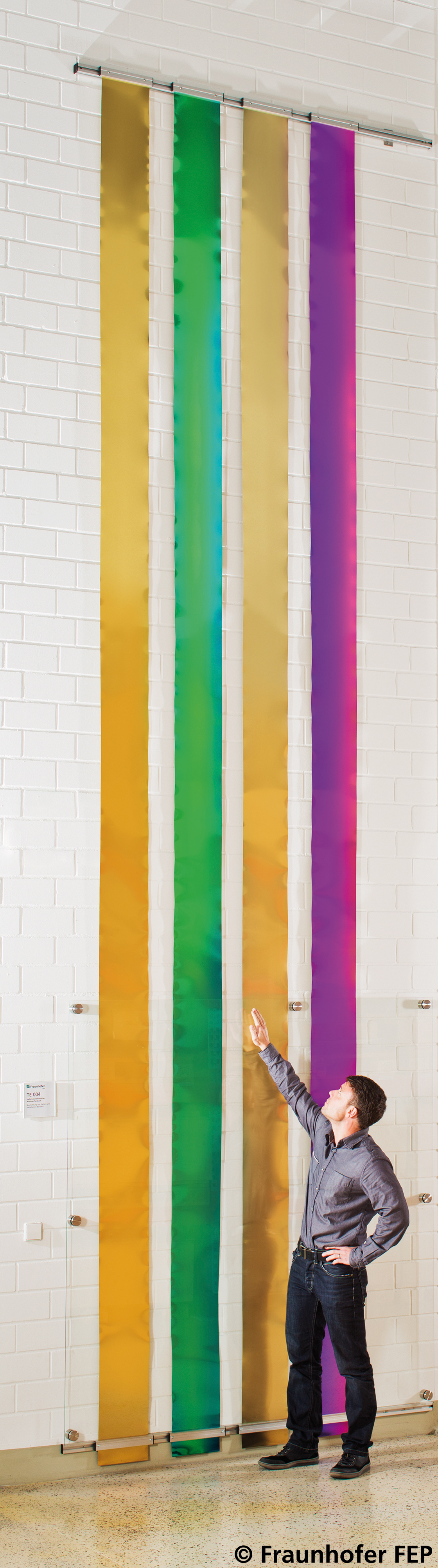 Prof. Metzner, Abteilungsleiter »Beschichtung von Platten und Metallbändern« am Fraunhofer FEP, erklärt: »Durch jahrelange Erfahrung in der Entwicklung von Prozessen können wir heute unseren Kunden und Partnern ein breites Spektrum an dekorativen Schichten anbieten und für den jeweiligen Einsatzzweck optimieren.«