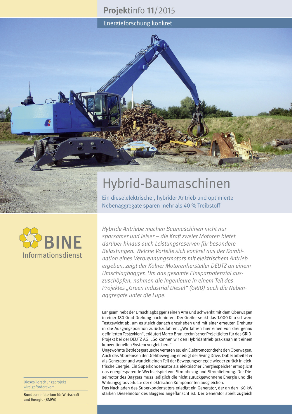 Auch in Nutzfahrzeugen und Baumaschinen versprechen hybride Antriebe Vorteile. Auf dem Markt sind derartige Geräte allerdings noch Exoten. Das neue BINE-Projektinfo „Hybrid-Baumaschinen“ (11/2015) stellt einen Umschlagbagger mit dieselelektrischem Antrieb vor. Um den Elektromotor mit Strom zu versorgen, wird ein Teil der Bewegungsenergie über einen Generator in Strom umgewandelt und in Supercaps eingespeichert. Durch diese Maßnahmen und weitere Optimierungen verbraucht der Bagger bis zu 40% weniger Diesel und es stehen Leistungsreserven für besondere Belastungen zur Verfügung.