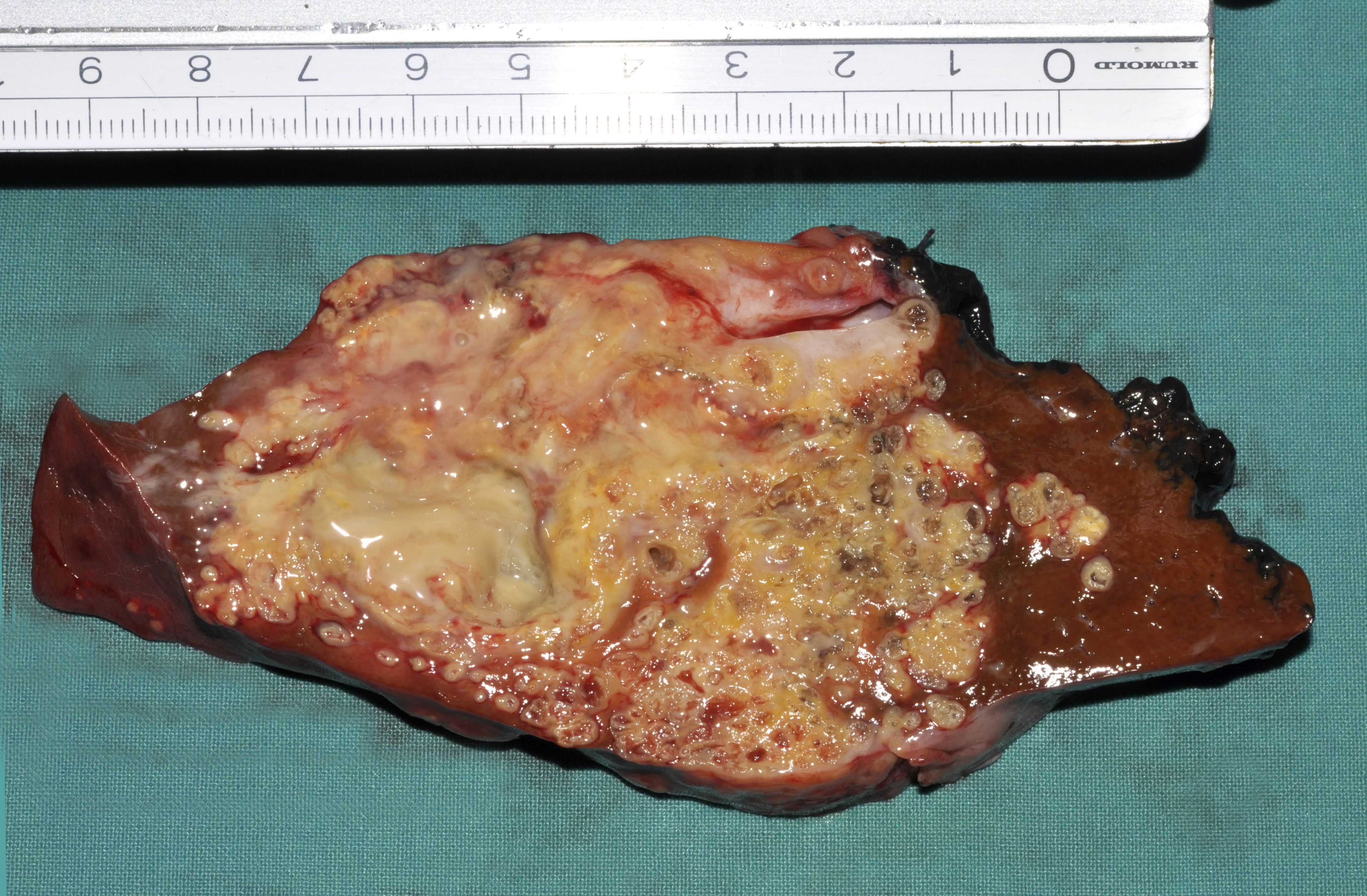 Schnittpräparat_Fuchsbandwurm (Foto: Universitätsklinik für Allgemein- und Viszeralchirurgie): Die alveoläre Echinokokkose der Leber wird durch das Larvenstadium des Fuchsbandwurms ausgelöst. Hier ein Schnittpräparat einer befallenen Leber nach der Operation