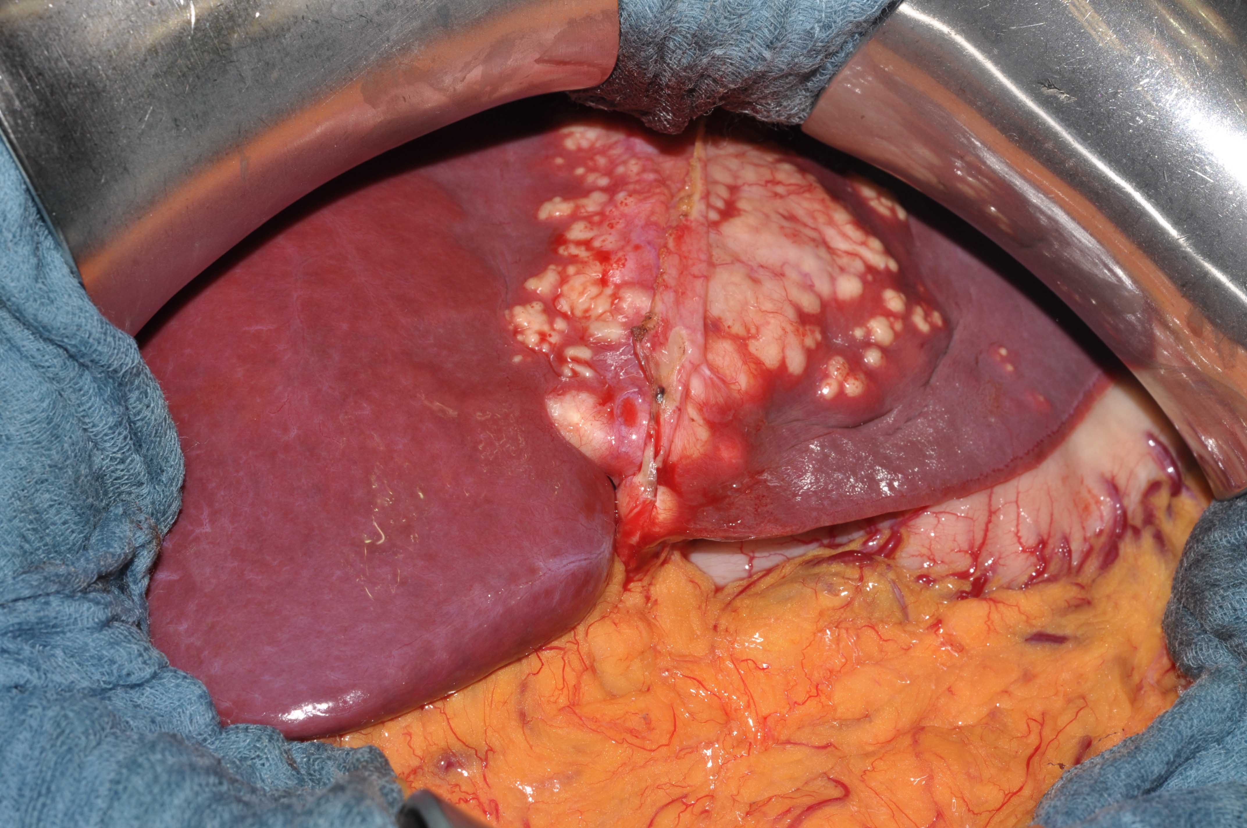 Situs_Fuchsbandwurm1 (Foto: Universitätsklinik für Allgemein- und Viszeralchirurgie): Rund ein Drittel der Patienten mit Fuchsbandwurmerkrankungen kann durch eine Operation geheilt werden. Im Bild: Befallene Leber