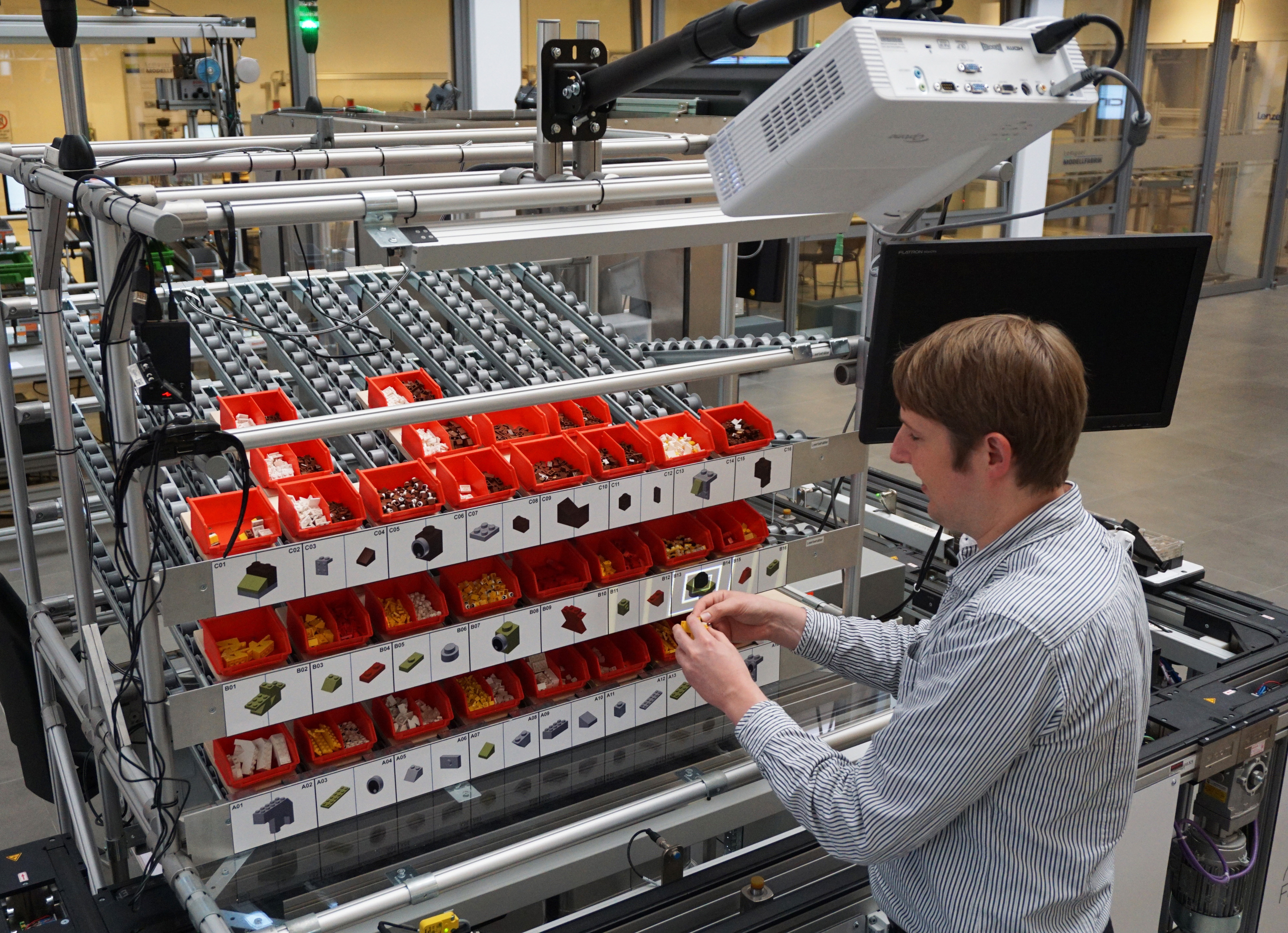 Soll der Monteur beispielsweise ein Produkt aus mehreren Einzelteilen zusammenbauen, hilft ihm die projektionsbasierte AR-Umgebung in einem ersten Schritt dabei, das richtige Bauteil auszuwählen. Zu montierende Einzelteile werden virtuell bzw. farblich markiert und zeigen dem Mitarbeiter so an, welches Teil er jeweils greifen soll. „Pick-by-Vision“ oder „Pick-by-Light“ heißt dieser Ansatz in der Fachsprache. In einem zweiten Schritt wird ein 3D-Modell auf einer Fläche am Handarbeitsplatz eingeblendet, das dem Monteur zeigt, wie und wo das ausgewählte Bauteil passgerecht zu montieren ist.