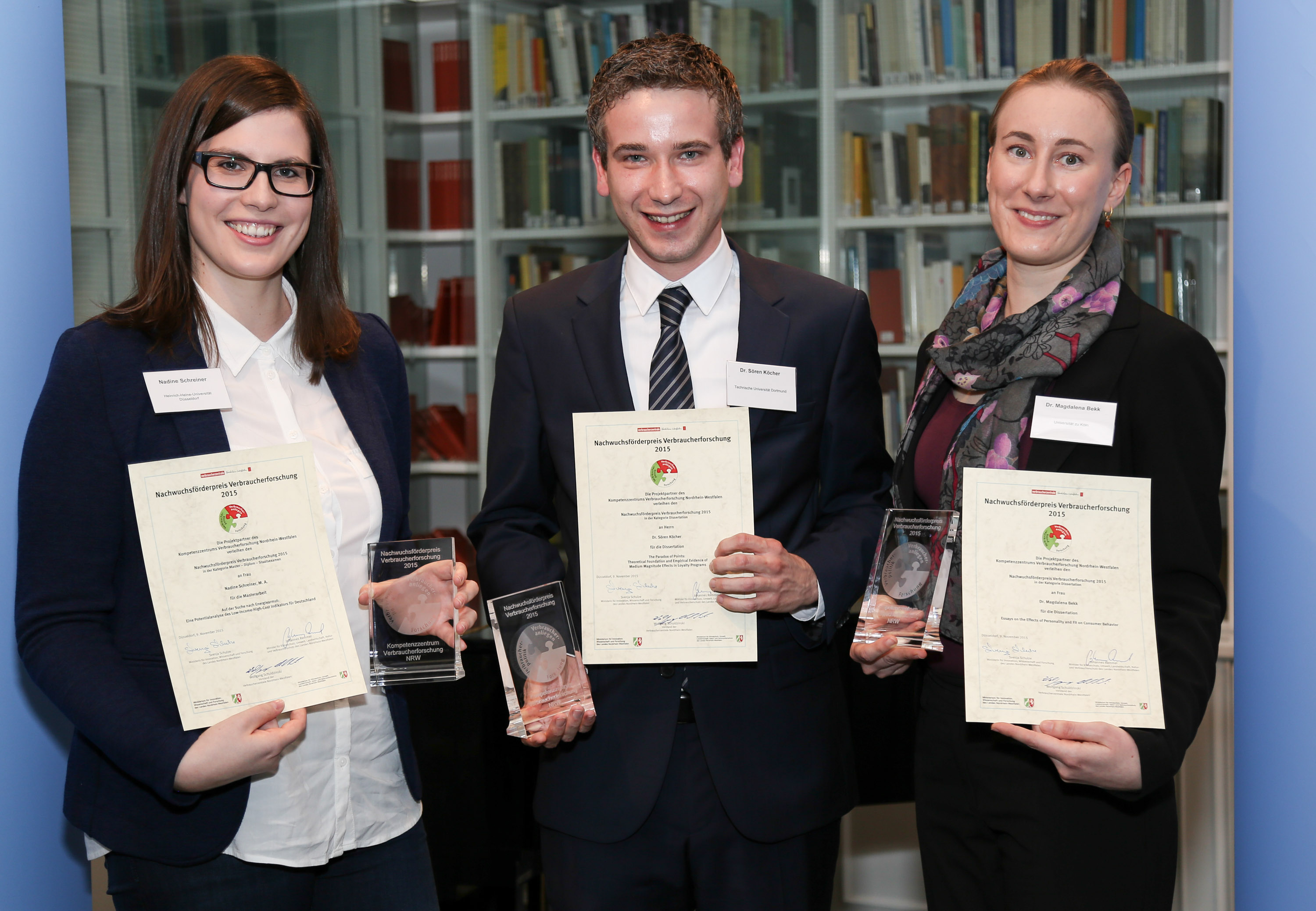 Drei junge Wissenschaftlerinnen und Wissenschaftler der Universitäten Siegen, Köln und Dortmund wurden beim 8. NRW-Workshop Verbraucherforschung mit dem "Nachwuchsförderpreis Verbraucherforschung 2015‟ ausgezeichnet. Die im Rahmen des Projekts Kompetenzzentrum Verbraucherforschung NRW (KVF NRW) ausgelobten Preise werden für wissenschaftlich exzellente und praxisrelevante Abschlussarbeiten vergeben.