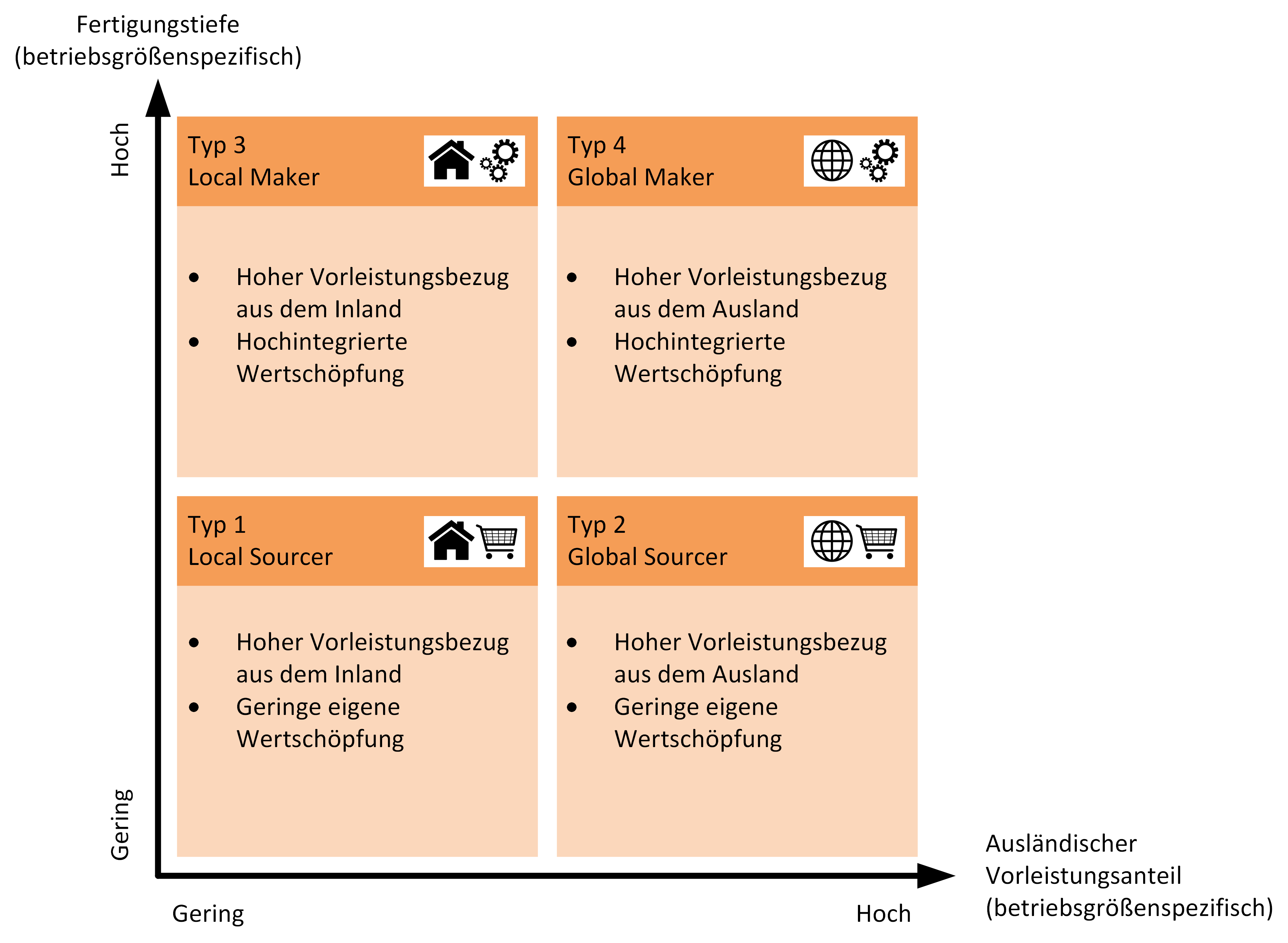 Dr. Djerdj Horvat, Projektleiter am Fraunhofer ISI, fasst zusammen: „Unternehmen des Typs „local maker“ verbinden erfolgreich die Produktivitätsvorteile einer hohen eigenen Fertigungstiefe mit den Flexibilitätsvorteilen eines hohen Vorleistungsbezugs aus dem lokalen Umfeld“ (siehe Abbildung).