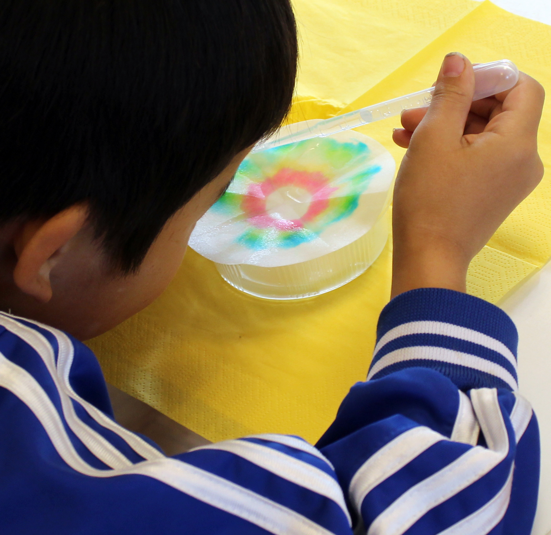 Auf den Kaffeefilter wird mit dem wasserlöslichen schwarzen Stift ein Kreis gemalt. Hier tropft das Kind nach und nach Wasser hinein. Das Wasser breitet sich auf dem Kaffeefilter aus und spült die Farbe in Richtung Außenrand. Die dunkle Farbe trennt sich und wird, in einem bestimmten Abstand, immer heller. Dieses Experiment, die Chromatografie, zeigt zum Beispiel, dass schwarze Filzstifte aus mehr als nur dunkler Farbe bestehen.