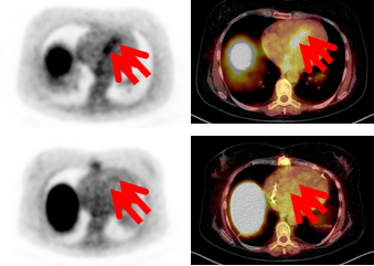 Der Grund, warum man beim Patienten so wenig über die Heilung nach Schädigung des Herzens weiß, liegt daran, dass es keine einfachen Verfahren gibt, die relevanten physiologischen Vorgänge zu erfassen. Blutwerte sind zu ungenau, Biopsien – also die Entnahme von kleinen Gewebestücken – sind für die Patienten zu belastend und es kann auch sein, dass man nicht das betroffene Areal findet oder trifft. Den Würzburger Medizinern Dr. Reiter und Dr. Lapa aus der Forschungsgruppe um Professor Bauer ist es jedoch gelungen, die Entzündungsvorgänge im menschlichen Herzen direkt darzustellen: Ihre Verfahren und Ergebnisse publizierten sie in den international renommierten Fachmagazinen International Journal of Car-diology und dem European Heart Journal. Die Forscher nutzen nuklearmedizinische Verfahren in Kombination mit der Kernspintomographie, um die Zellen und Umbauvorgänge während der Entzündung im Herzen abzu-bilden. „Zunächst musste die Gruppe molekulare Spürsonden entwickeln, die die Entzündungszellen sichtbar machen. Das gelang den Forschern Dr. Li und Prof. Samnick mit einer radiochemischen Methode, bei der molekulare Strukturen auf der Oberfläche von Immunzellen markiert werden. Das Ausmaß der Gewebeschä-digung im Herzen wurde mit der Kernspintomographie dargestellt. Dabei kann man z.B. das Gewebewasser, das bei einer Entzündung vermehrt ist, oder abgestorbene Zellengruppen sehen. Durch die Kombination der nuklearmedizinischen Technik mit der Kernspintomographie war es uns letztendlich möglich, erstmals bei Patienten das Ausmaß der Schädigung des Herzmuskels nach einem Infarkt darzustellen“, erklärt Prof. Bauer.