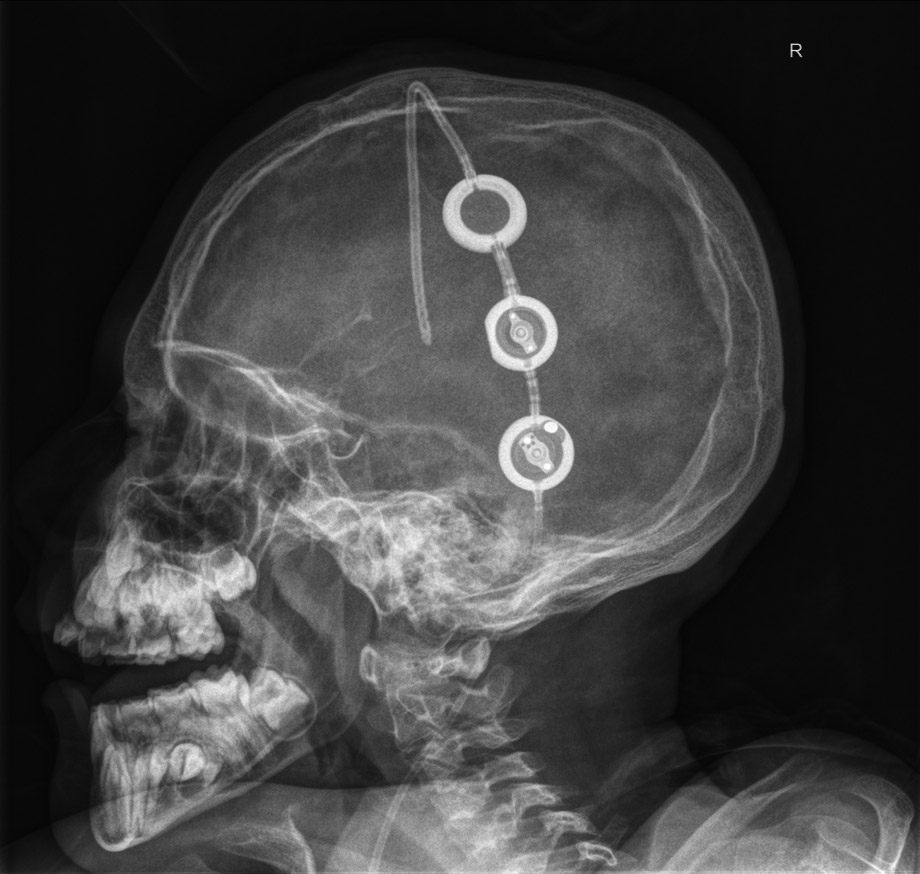 Seitliche Röntgenaufnahme des Schädels eines Patienten, bei dem ein Shuntsystem implantiert worden ist. Das hier sichtbare Ende des Schlauchsystems reicht in die inneren Hirnkammern während das andere Ende bis in den Bauchraum geführt wird (nicht abgebildet) Über die kreisförmigen Ventileinheiten wird der Abflusswiderstand des Hirnwassers reguliert. Foto: Uniklinikum Dresden