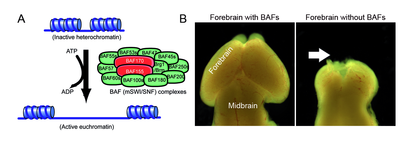 Der BAF-Multiproteinkomplex ist in der Hirnentwicklung das zentrale Steuerelement für die Aktivierung von Programmen, die zur Neubildung von Nervenzellen führen. Seine Anlagerung an bestimmte Abschnitte des Genoms initiiert den Umbau der Chromatin-Struktur. Dabei wird inaktives, kondensiertes Chromatin (Heterochromatin) in die locker gepackte aktive Form (Euchromatin) umgewandelt. Die für die neuronale Differenzierung notwendigen Gene werden dadurch für bestimmte Transkriptionsfaktoren zugänglich und können an- oder abgeschaltet werden. Welche Bereiche des Chromatins einem Umbau unterzogen werden, wird zuvor durch epigenetische Einflüsse gesetzte, chemische Markierungen bestimmt.