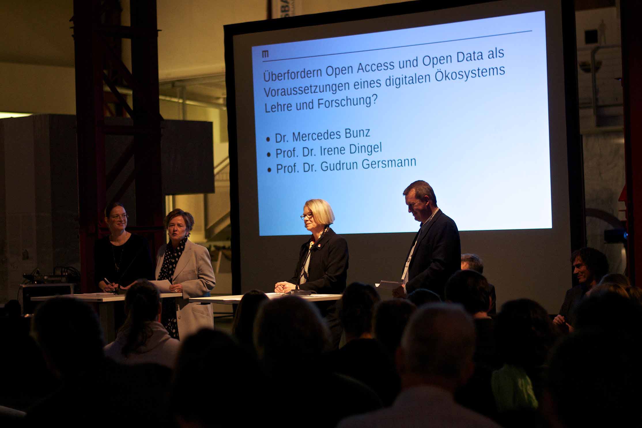 Angeregt durch zahlreiche Fragen und Meinungen aus dem Publikum näherten sich Prof. Dr. Walter Bisang (JGU), Dr. Mercedes Bunz (University of Westminster), Prof. Dr. Irene Dingel (Institut für Europäische Geschichte), Prof. Dr. Gudrun Gersmann (Universität zu Köln), Prof. Dr. Marie-Hélène Lay (Universität Poitiers) und Dr. Uwe Schmidt (JGU) dem Thema unter verschiedenen Aspekten. So sprach Walter Bisang das Verhältnis zwischen Fachkenntnissen und technischer Affinität an und fragte, wie hilfreich westliche Technologien bei der Erforschung nichtwestlicher Kulturen sein können? Eine mögliche „Ver-naturwissenschaftlichung“ der Geisteswissenschaften thematisierte Prof. Dr. Mechthild Dreyer, Vizepräsidentin für Studium und Lehre an der JGU. Und Irene Dingel stellte heraus, dass die Digitalisierung der Fächer sicherlich zu mehr Interdisziplinarität führen werde.